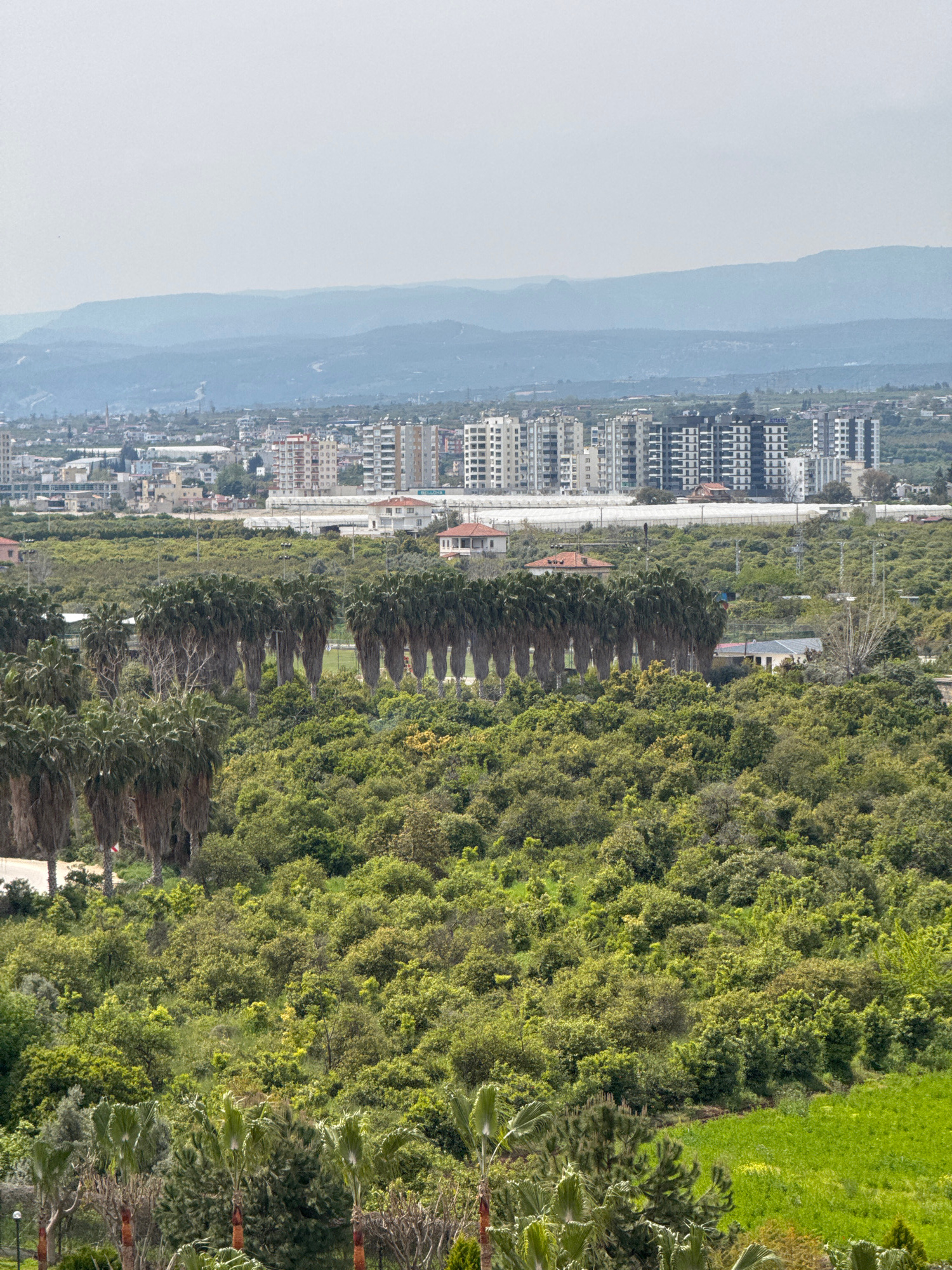 This is a high-angle, wide shot showing a view of the city of Erdemli, Turkey. In the distance, a mountain range is visible on the left side of the frame, obscured by haze. Closer to the middle is the…read more