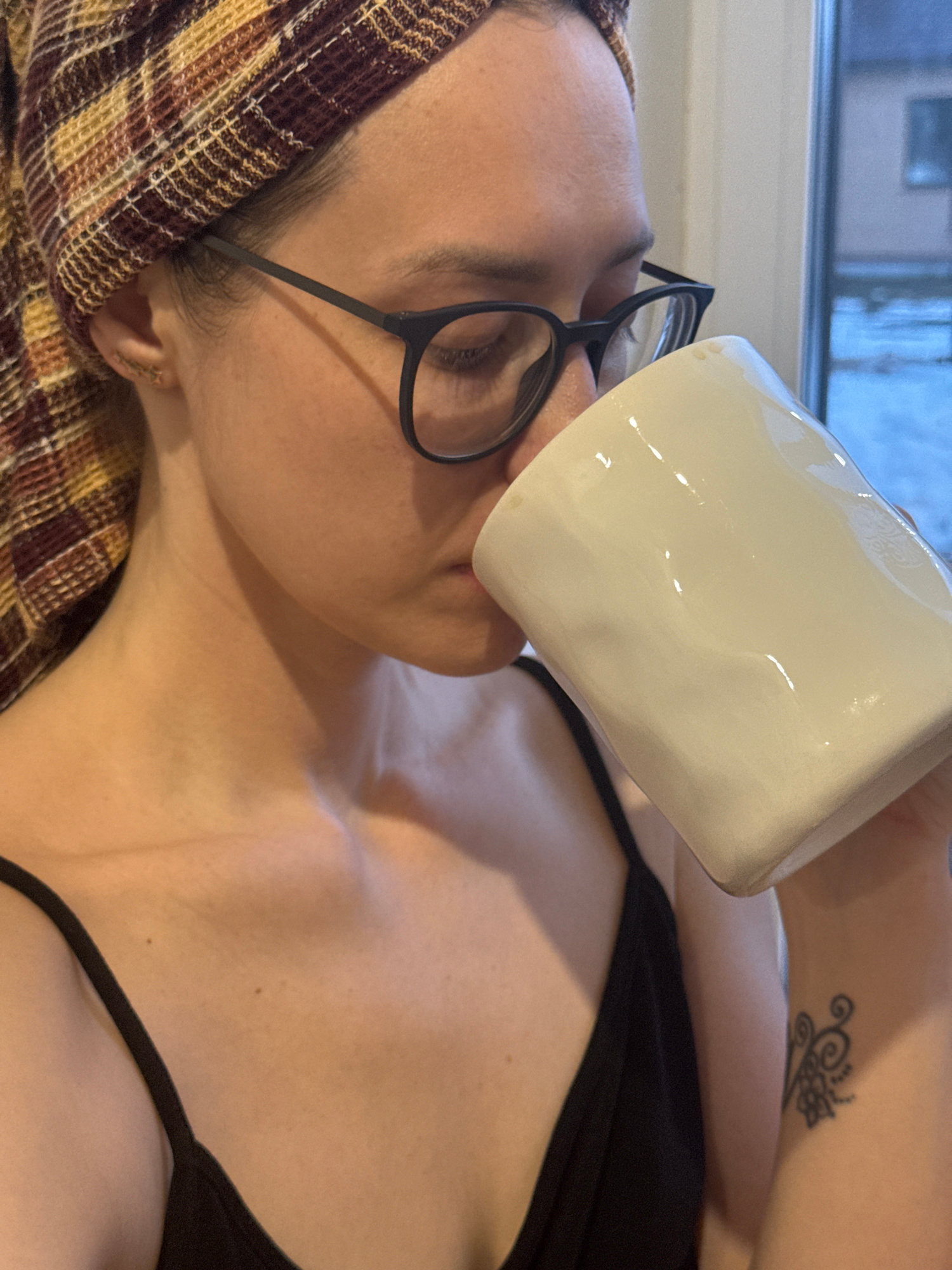 A woman wearing glasses and a headscarf is lying on her back, drinking from a large, white mug. She is wearing a black tank top. A tattoo is visible on her upper chest. The background includes a windo…read more