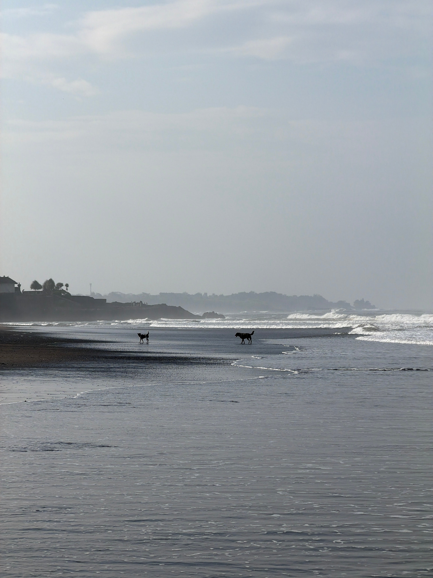 The image depicts a coastal scene on a beach in Belalang, Indonesia. The foreground consists of dark, wet sand and shallow ocean water with receding and approaching waves, marked by white foam lines.…read more