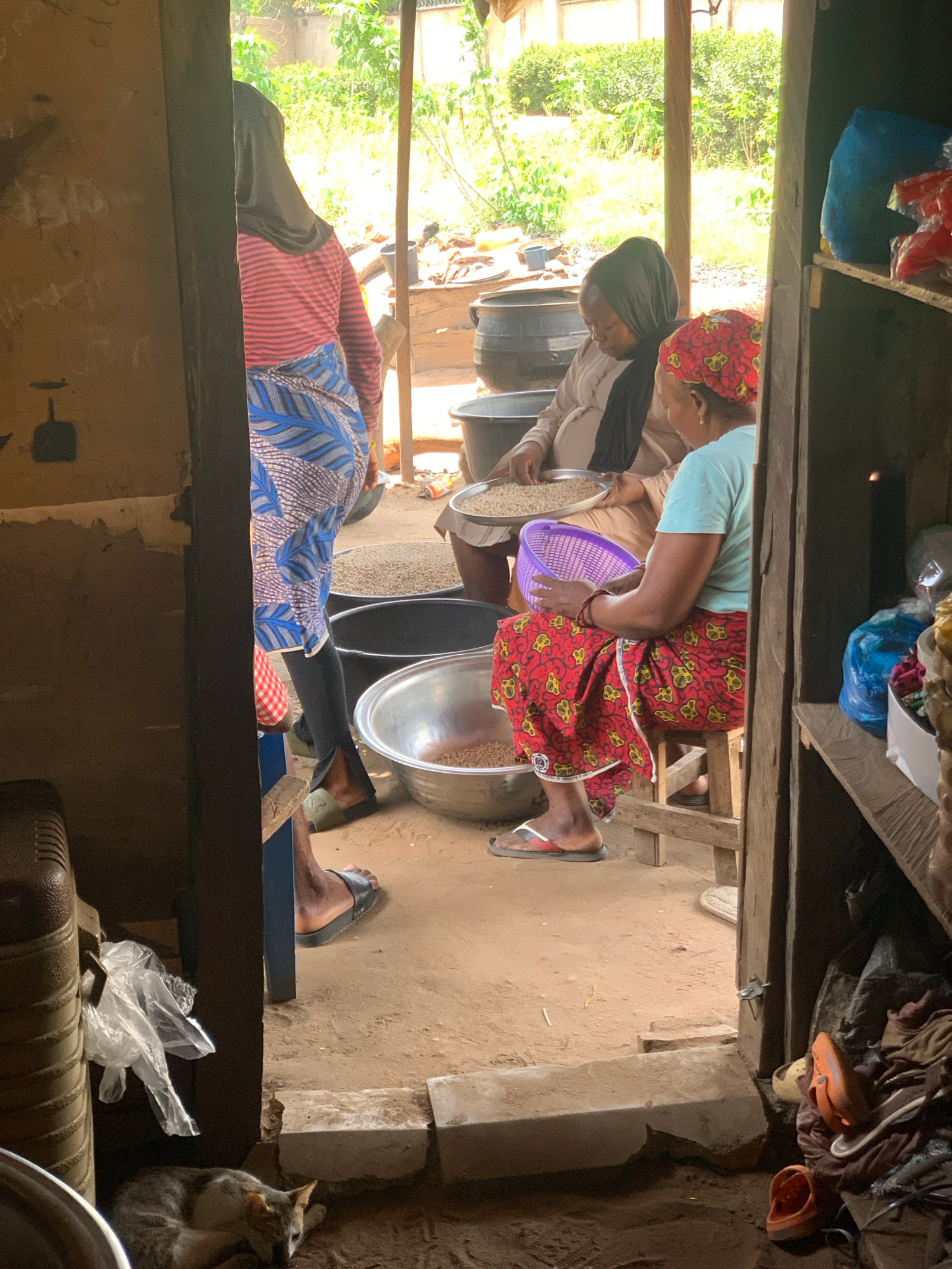 From an interior perspective in Lokoja, Nigeria, two women are processing grains outside, through what appears to be a window or doorway. One woman, wearing a headscarf and a patterned red skirt, sitsβ¦read more