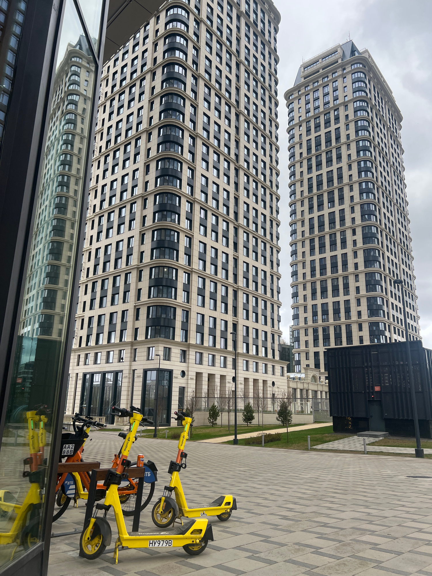 Two tall, modern buildings dominate the view. Their architecture features a repeating grid pattern of windows, accentuated by curved sections. A black rectangular structure sits adjacent to one buildi…read more