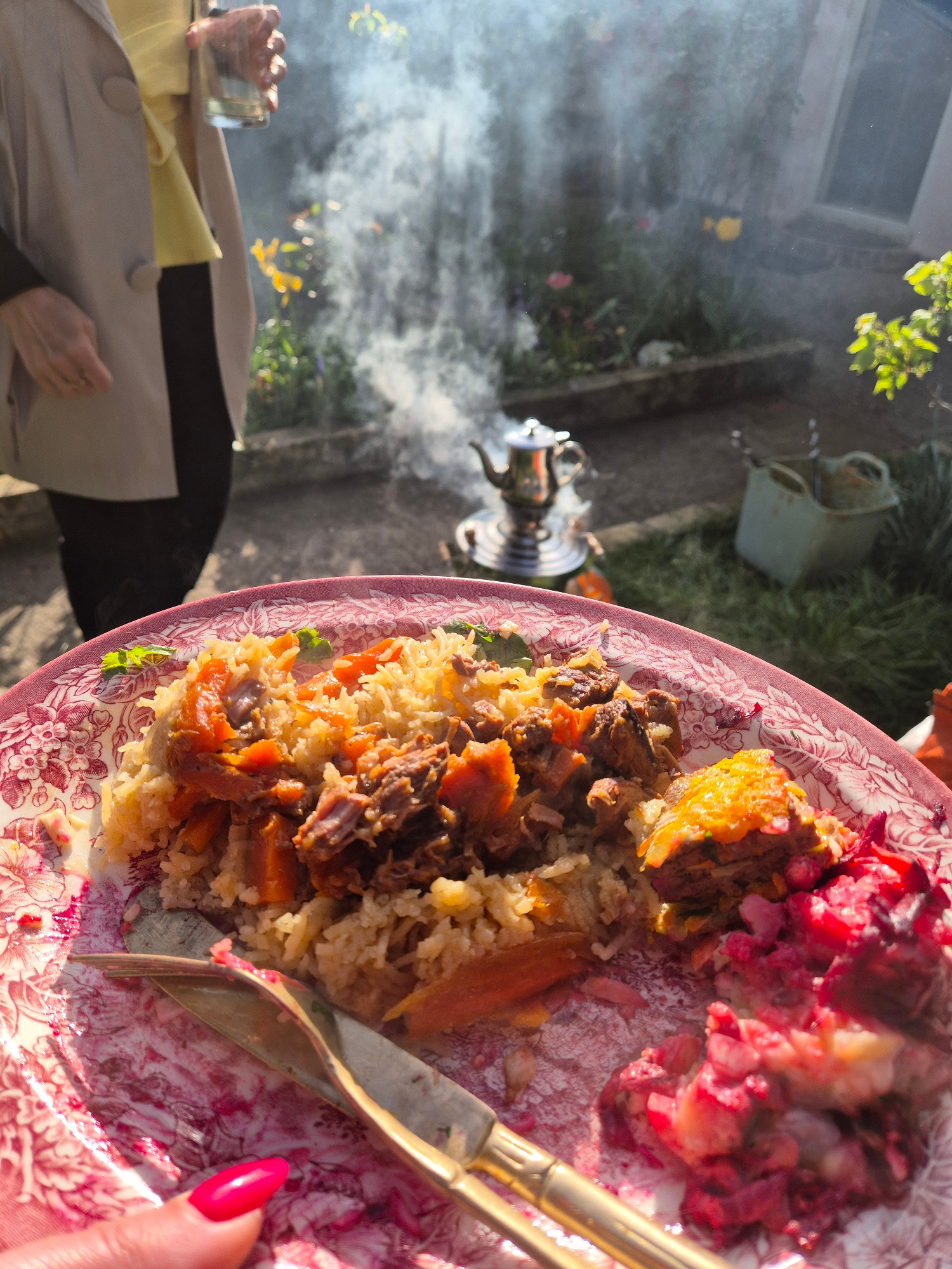 The image shows an outdoor scene with a plate of food in the foreground. The plate contains a rice dish with meat and vegetables, and a beet salad. A fork and knife rest on the plate, and a hand with…read more