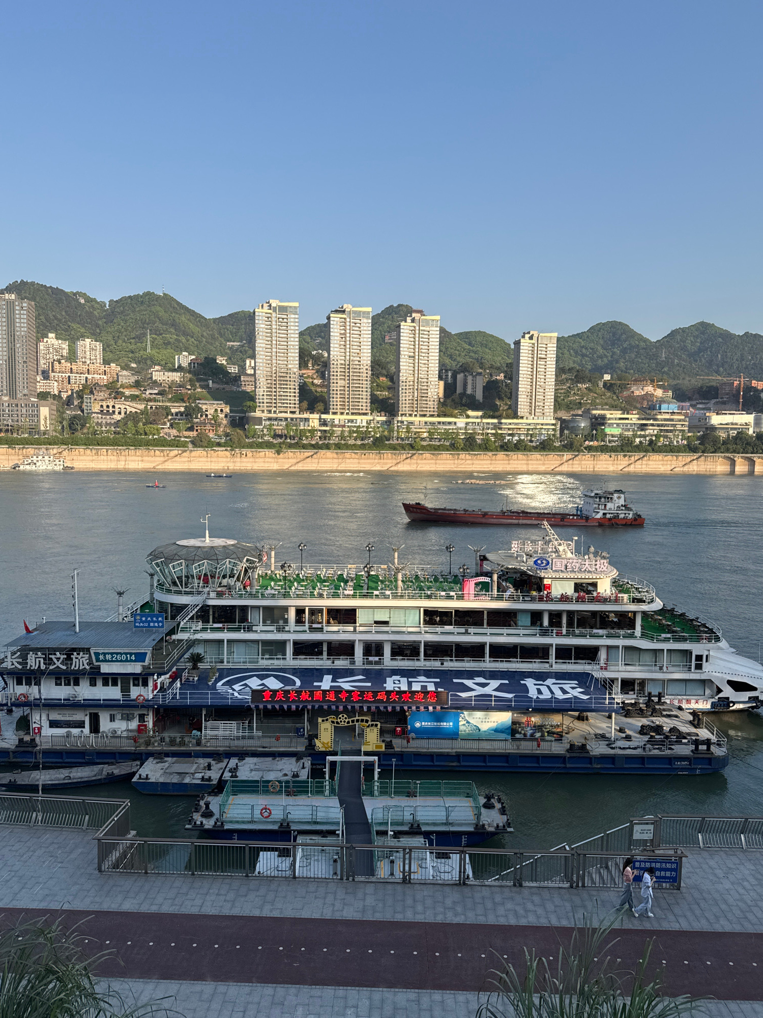 This aerial landscape depicts docked cruise ships with a city on the opposite bank. The city skyline is dominated by high-rise residential buildings backed by mountain terrain under a clear blue sky.…read more