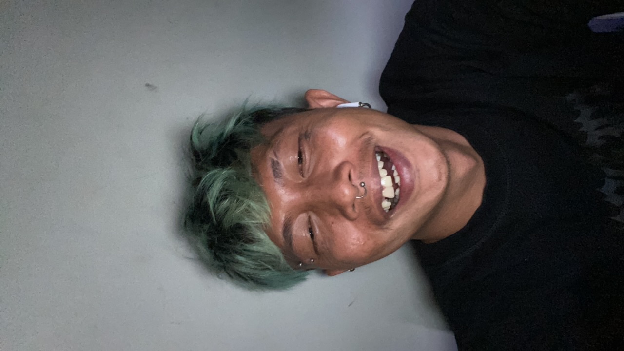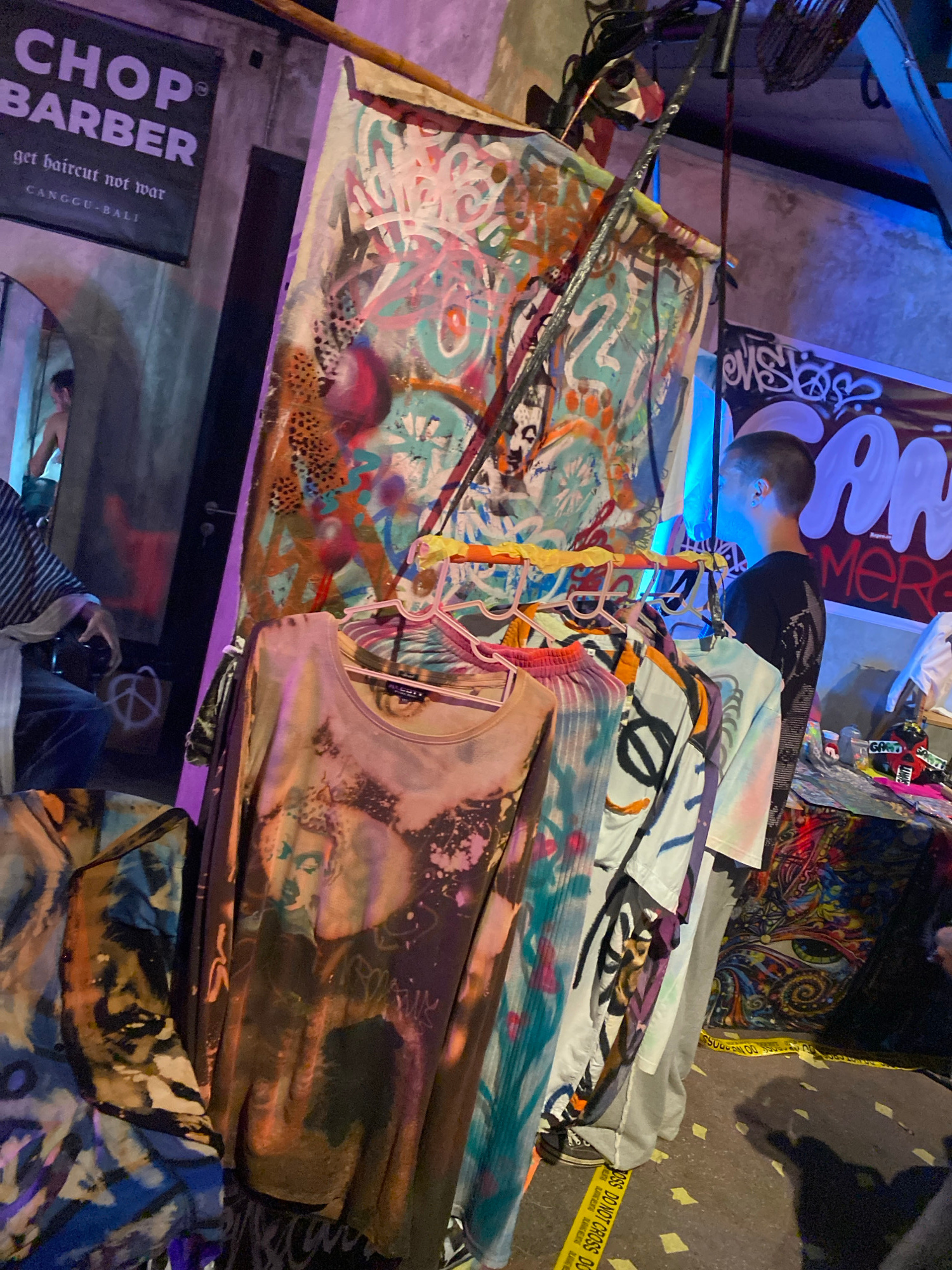 The image depicts an outdoor clothing rack in Canggu, Bali, Indonesia. The rack displays various colorful, tie-dye, and graffiti-style garments. A man wearing a black t-shirt is looking at the clothesβ¦read more