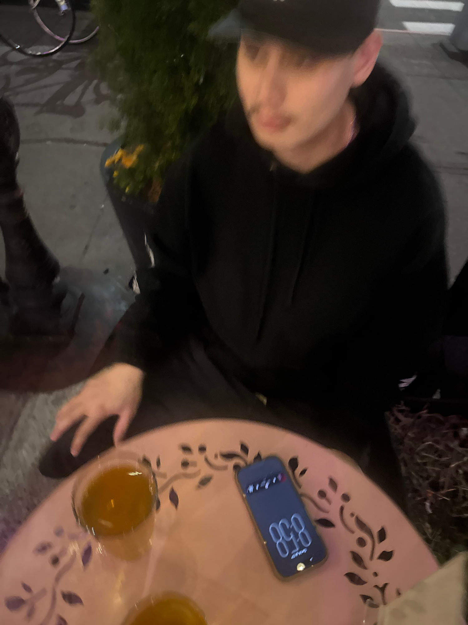 The image captures a person in a black hoodie and baseball cap seated at an outdoor table. The person is slightly out of focus but appears to be fair-skinned. The table, adorned with a floral cut-out…read more