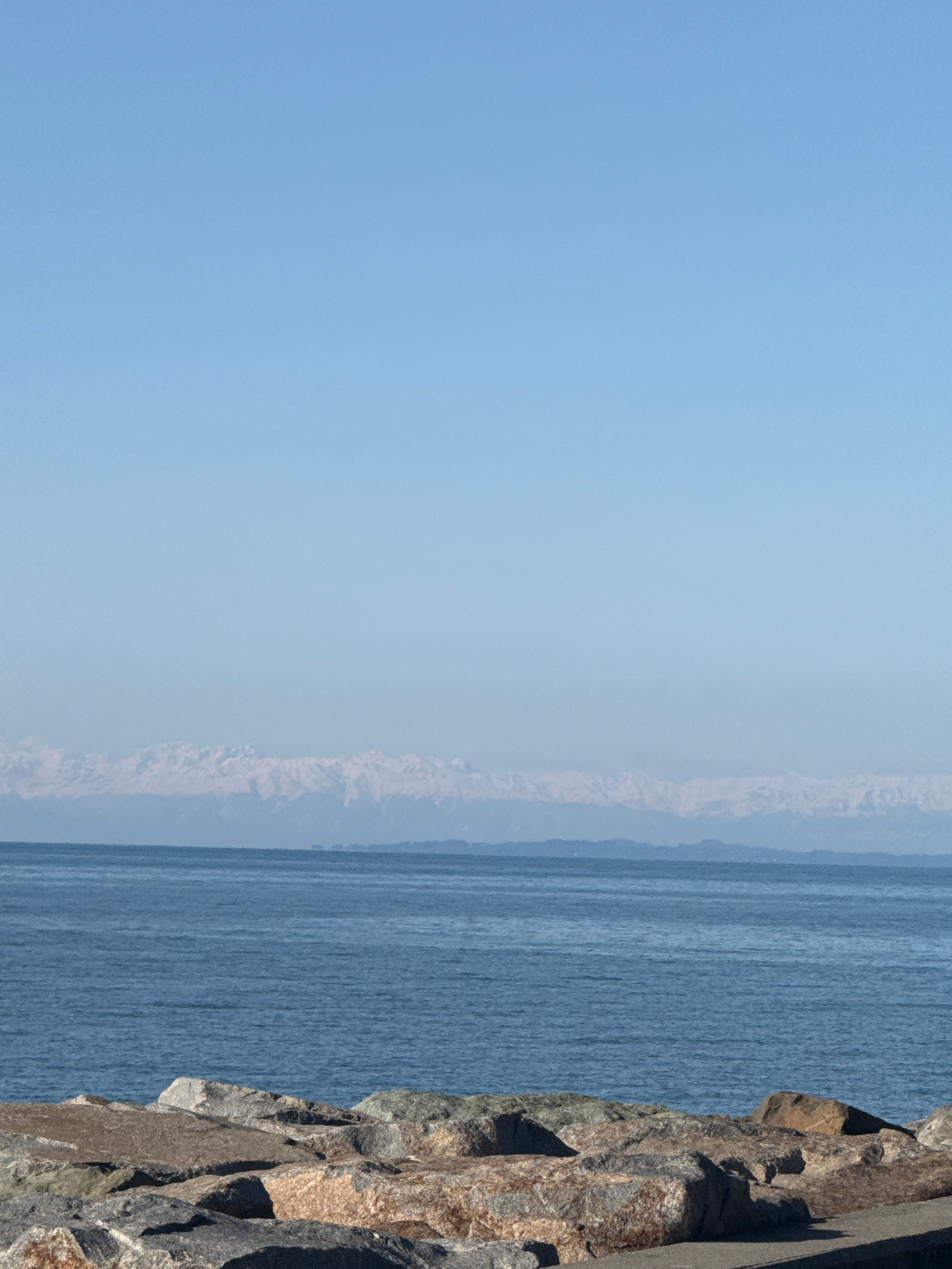 The image presents a serene coastal landscape, offering an expansive view of the sea and sky alongside a rugged shoreline. The upper portion of the frame is dominated by a clear, bright blue sky, indiβ¦read more