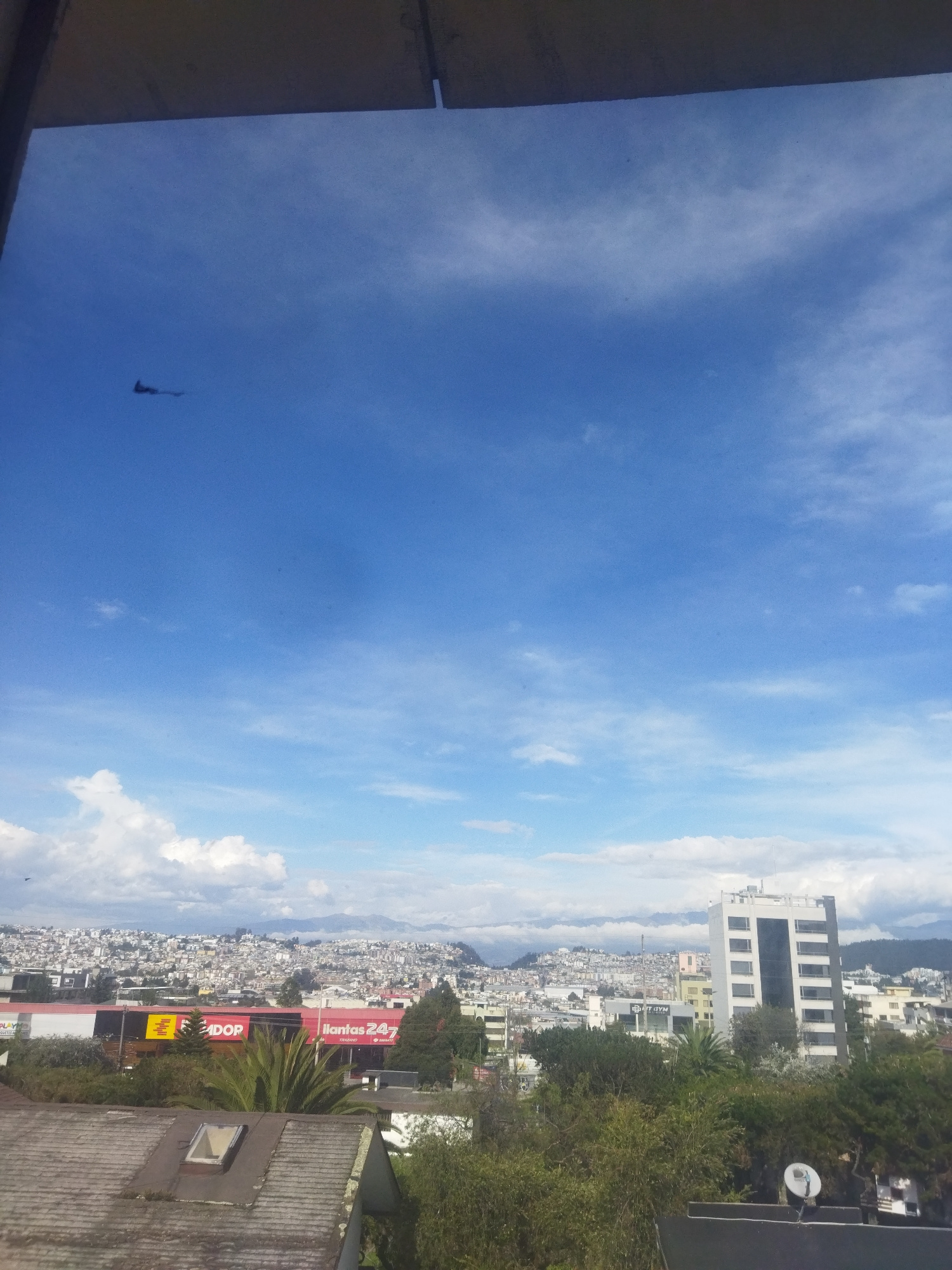 The image shows a cityscape in Quito, Ecuador, under a partly cloudy, blue sky. A bird, possibly a gull, is flying in the upper left portion of the frame. In the foreground, rooftops and trees are visβ¦read more
