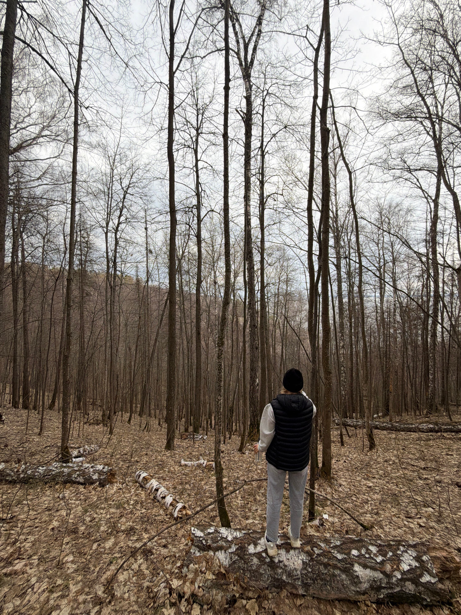A horizontal, medium-shot depicts a person in a forest. The person wears a black beanie, a black vest over a white long-sleeve shirt, and light grey pants. They stand on a forest floor covered in brow…read more
