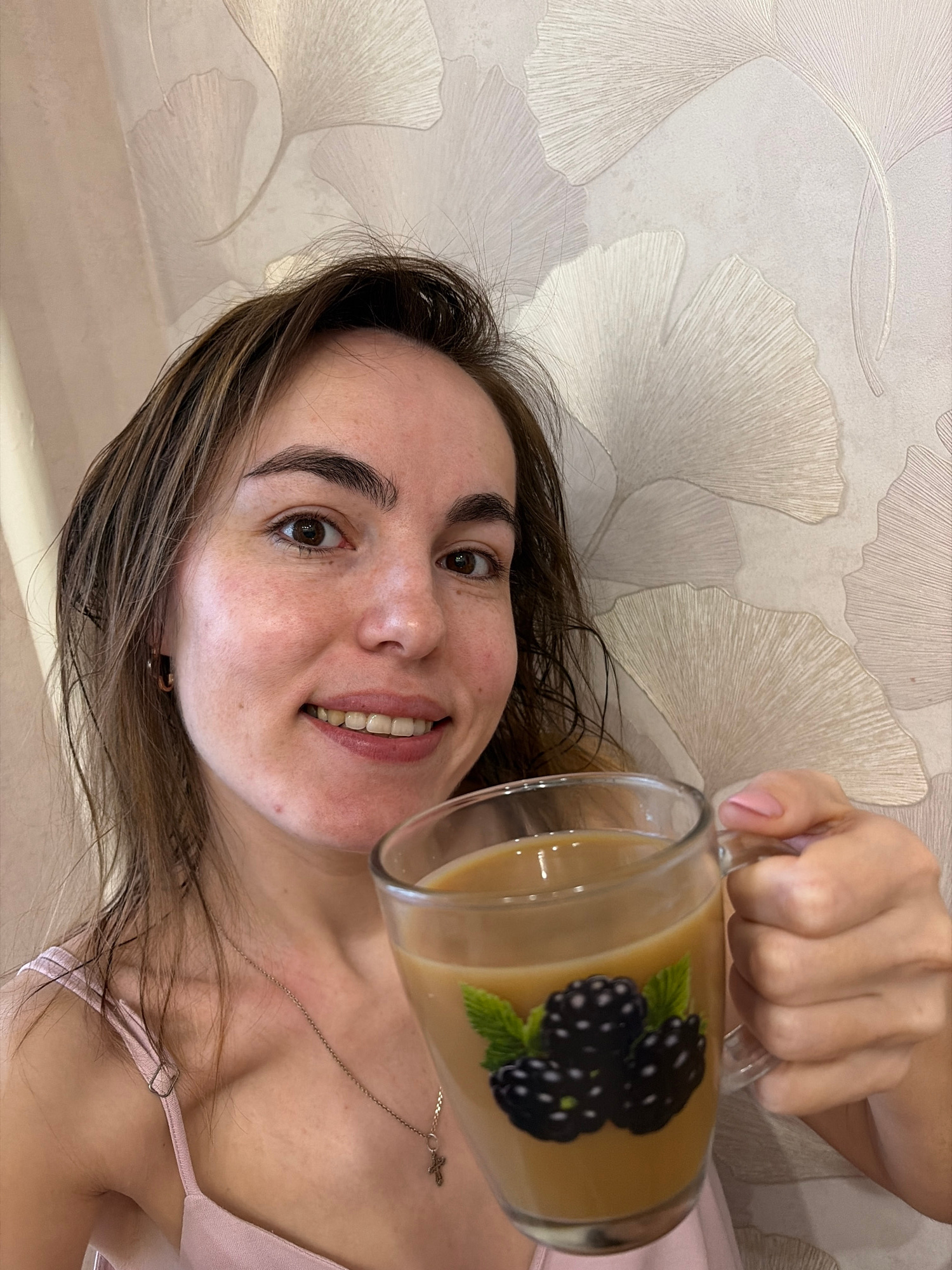 A woman with brown hair is holding a clear mug filled with a tan liquid, possibly coffee or tea with milk. The mug has a design of blackberries on it. The woman is smiling and looking at the camera. S…read more