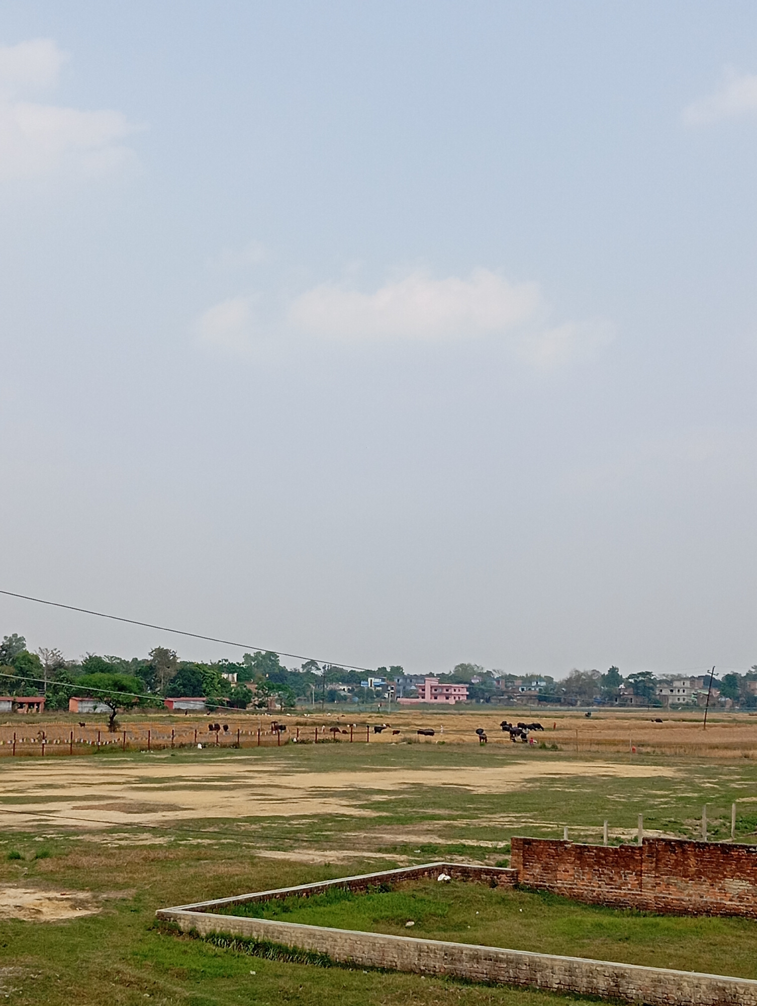 The image shows a scene in Oshojetban, Nepal. A large, grassy field dominates the foreground, with a partially constructed brick wall at its edge. Beyond the field, a fence runs across the midground,…read more