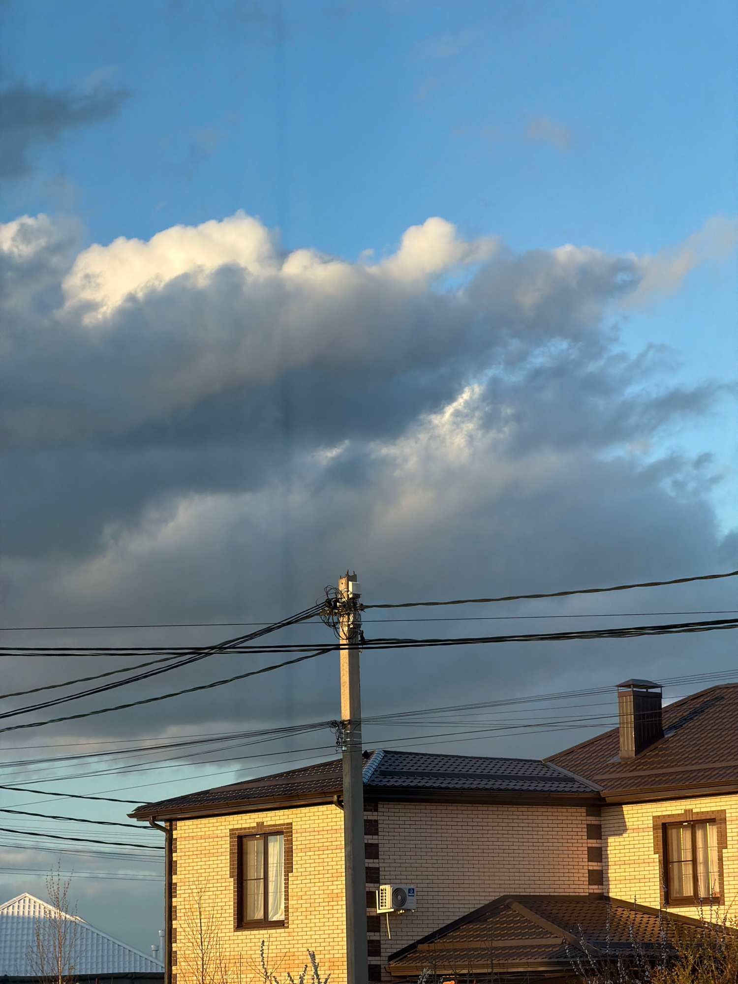 The image depicts a partly cloudy sky above houses and power lines in what appears to be the city of Rossiyskiy, Russia. The clouds are a mix of dark gray and bright white, suggesting a contrast betwe…read more