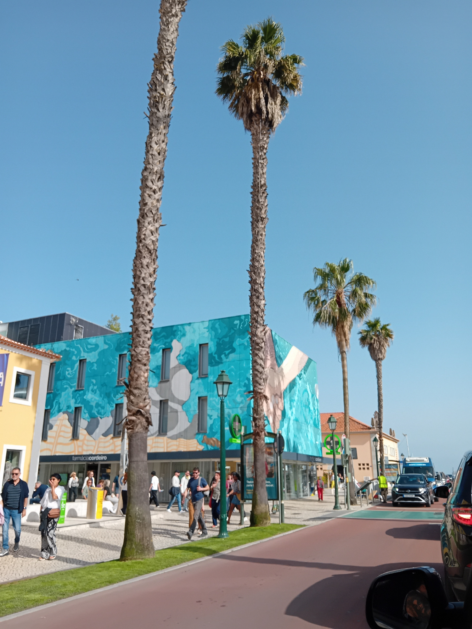 The image depicts a street scene in Cascais, Portugal, characterized by tall palm trees lining the sidewalk. A group of pedestrians are walking along the pavement, with shops and buildings forming theβ¦read more