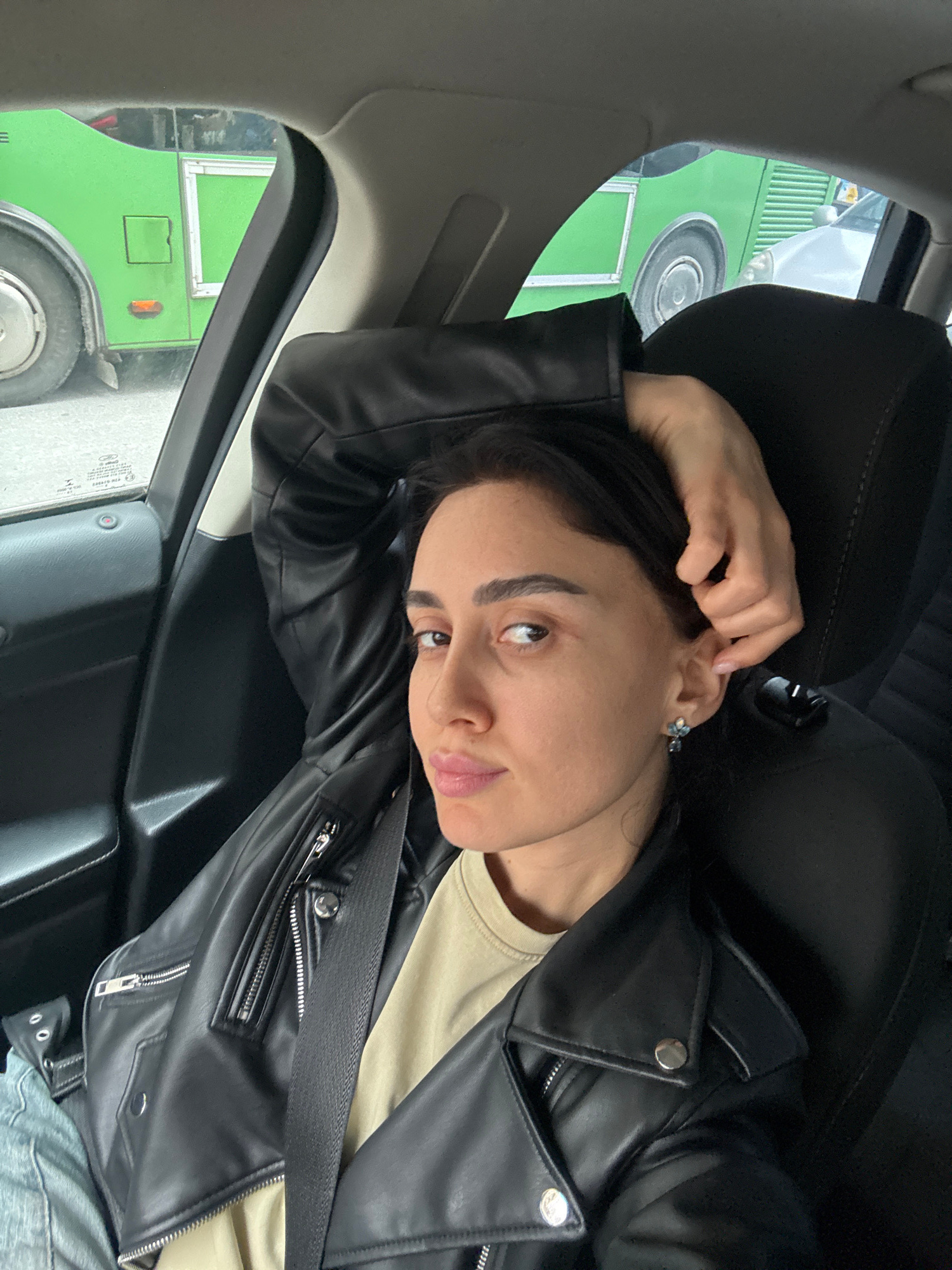 A female individual is positioned in the front passenger seat of a vehicle, facing the camera. She has dark hair and a light-to-medium complexion. She is dressed in a black faux leather jacket with si…read more