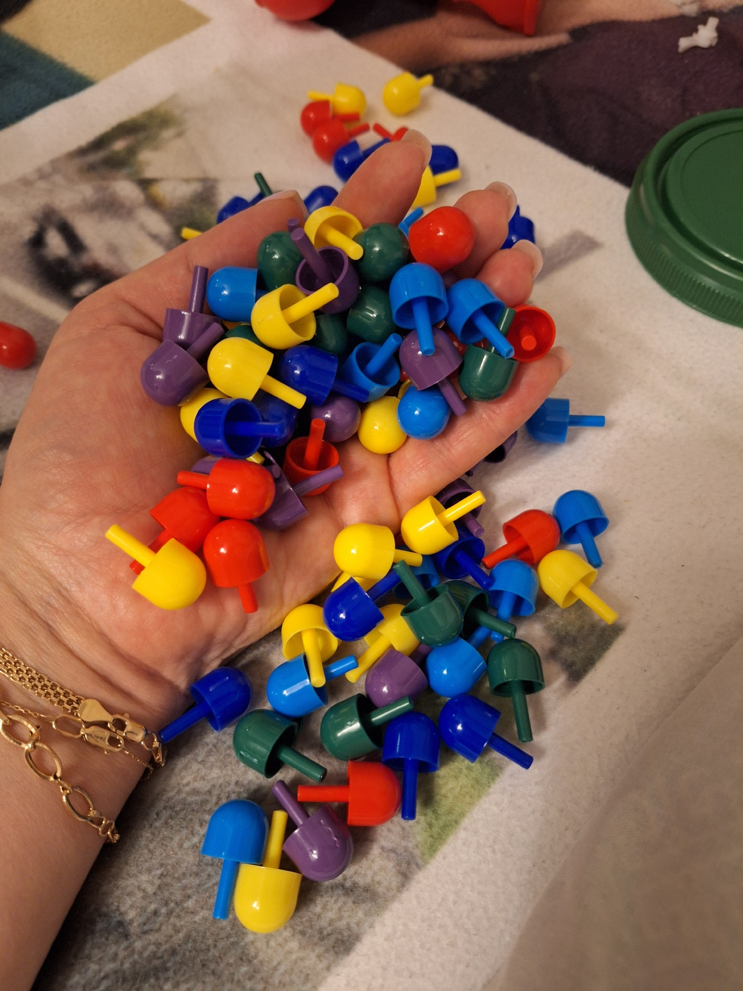 A close-up shot shows a person's hand holding a large quantity of small, colorful plastic peg pieces. The hand, adorned with a gold link bracelet on the wrist, is centered in the frame, overflowing wi…read more