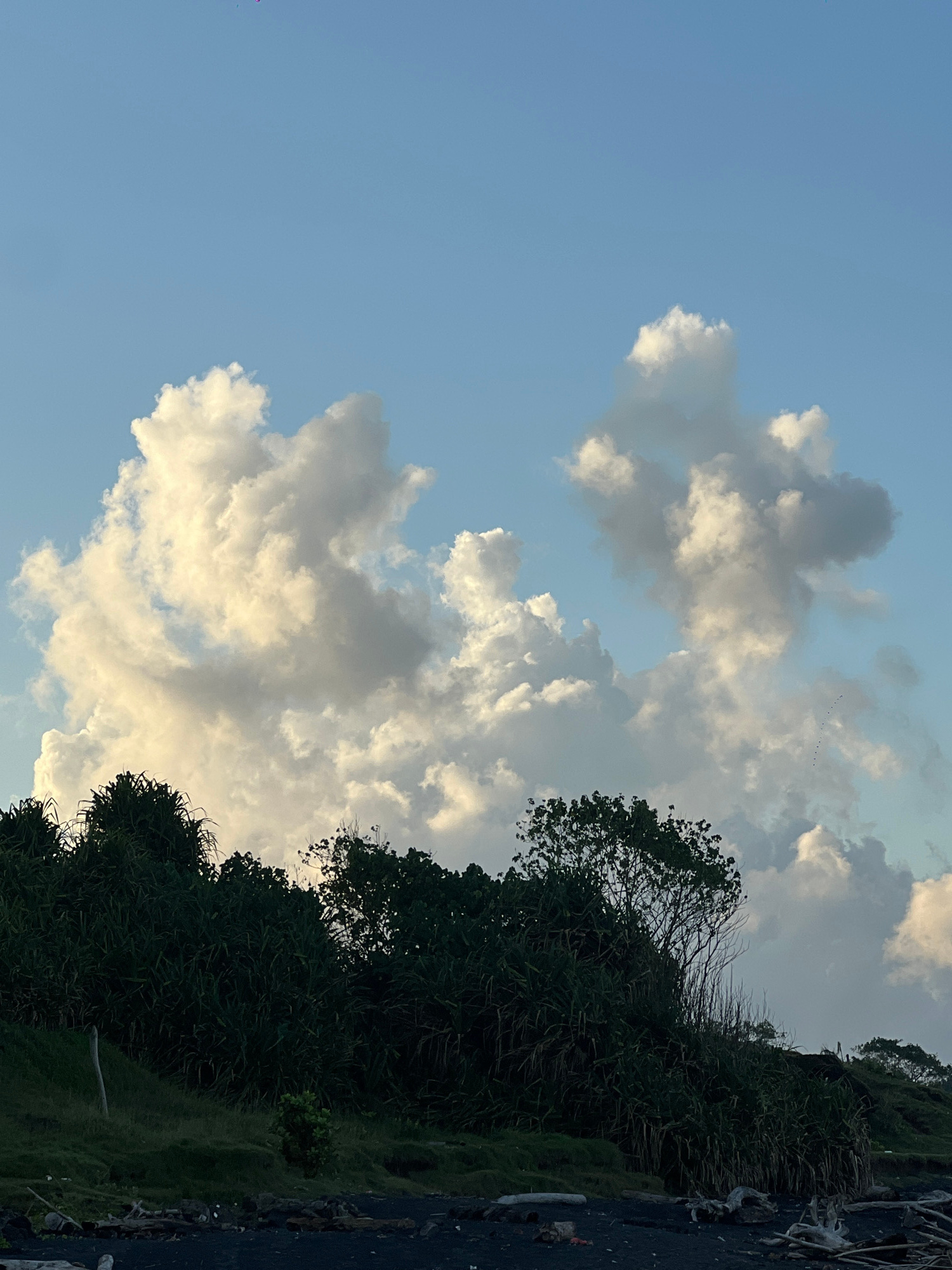 The image depicts a partially cloudy sky above a coastal landscape in an unknown city in Indonesia. The sky features cumulus clouds, with a blue sky visible in the gaps. The foreground shows dense, gr…read more