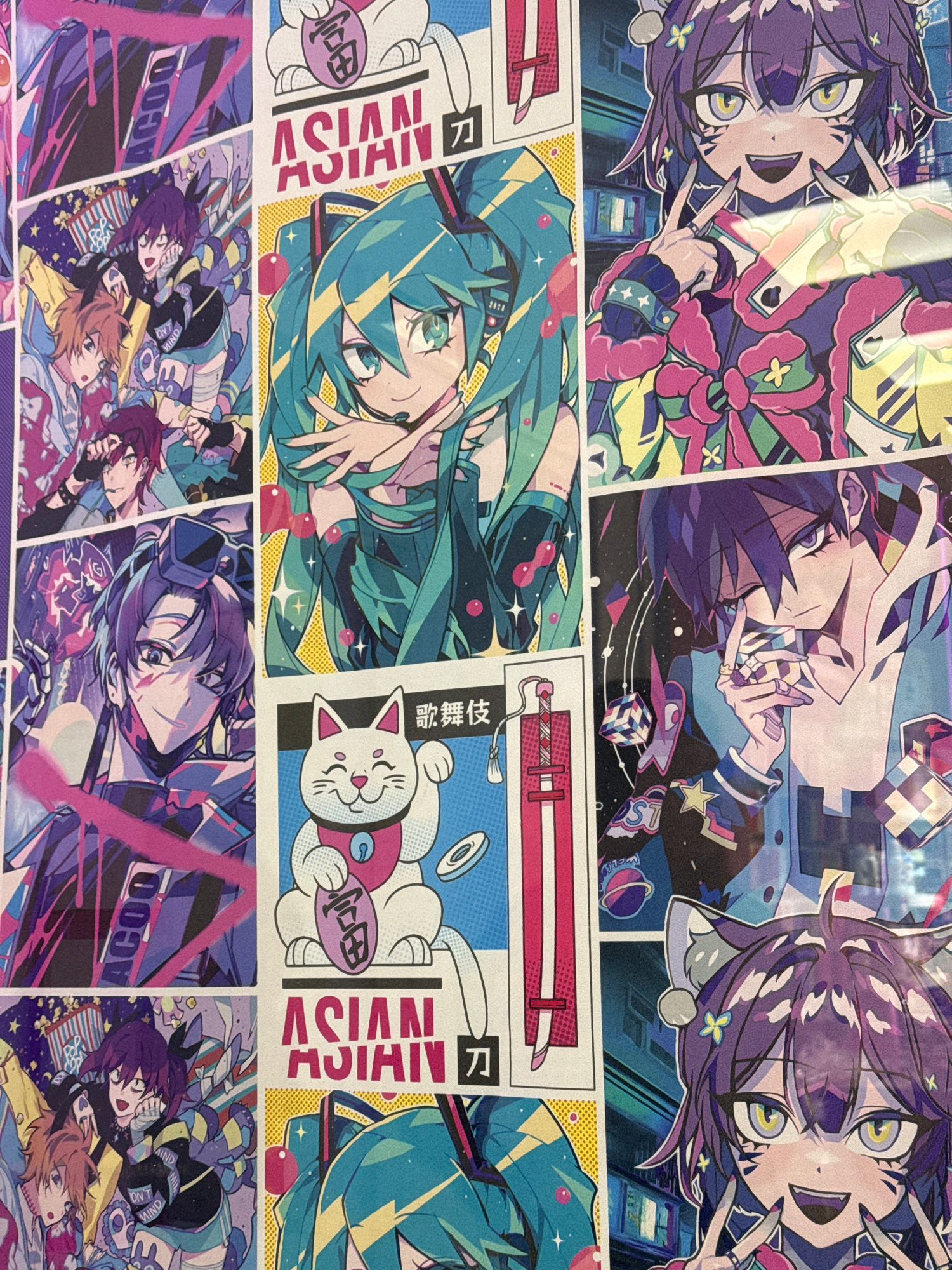 This image is a close-up shot of a printed surface featuring various anime-style illustrations arranged in a collage or comic book format. The artwork appears to depict multiple characters in vibrant,…read more
