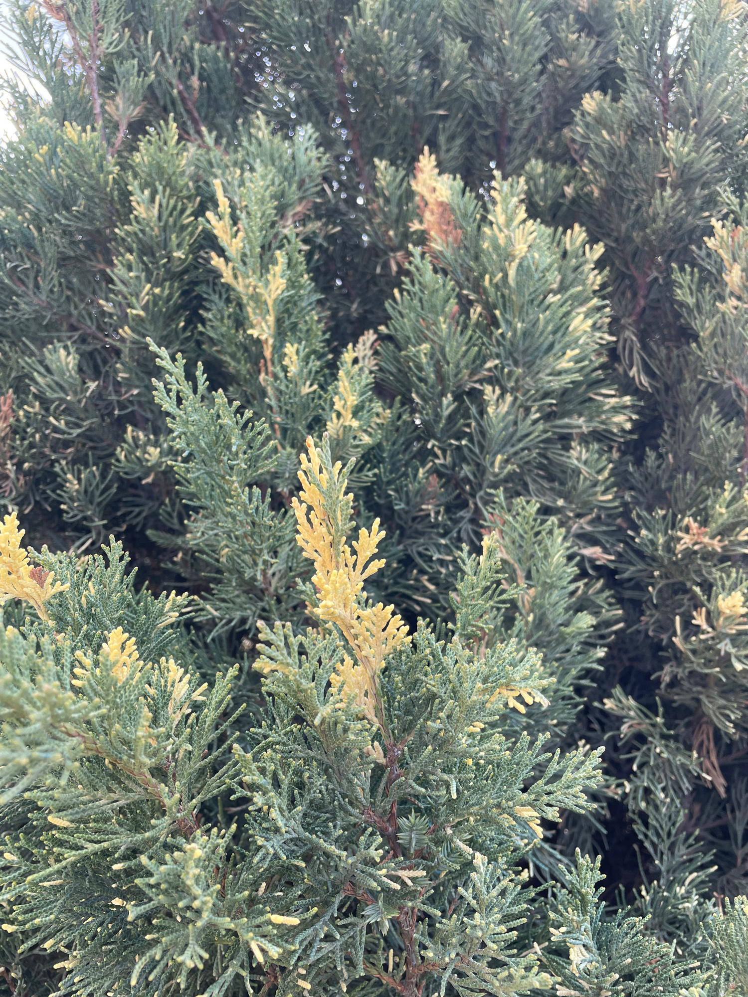 A close-up of a juniper bush with green and yellow foliage. The location is Yerevan, Armenia.
