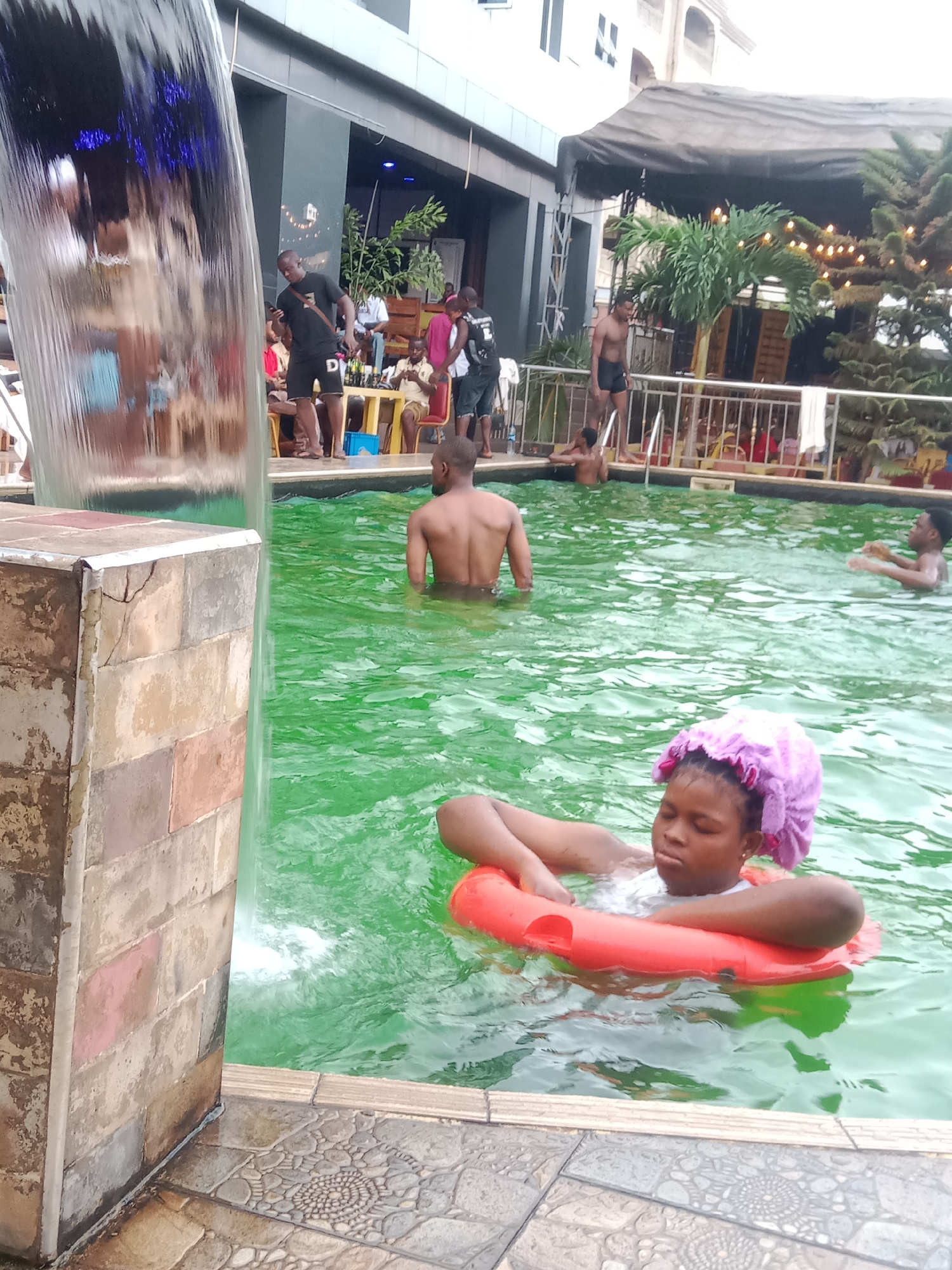 The image shows a swimming pool area at an unknown establishment in Onitsha, Nigeria. The water in the pool is greenish. Several individuals are present in and around the pool. A young woman in a lave…read more
