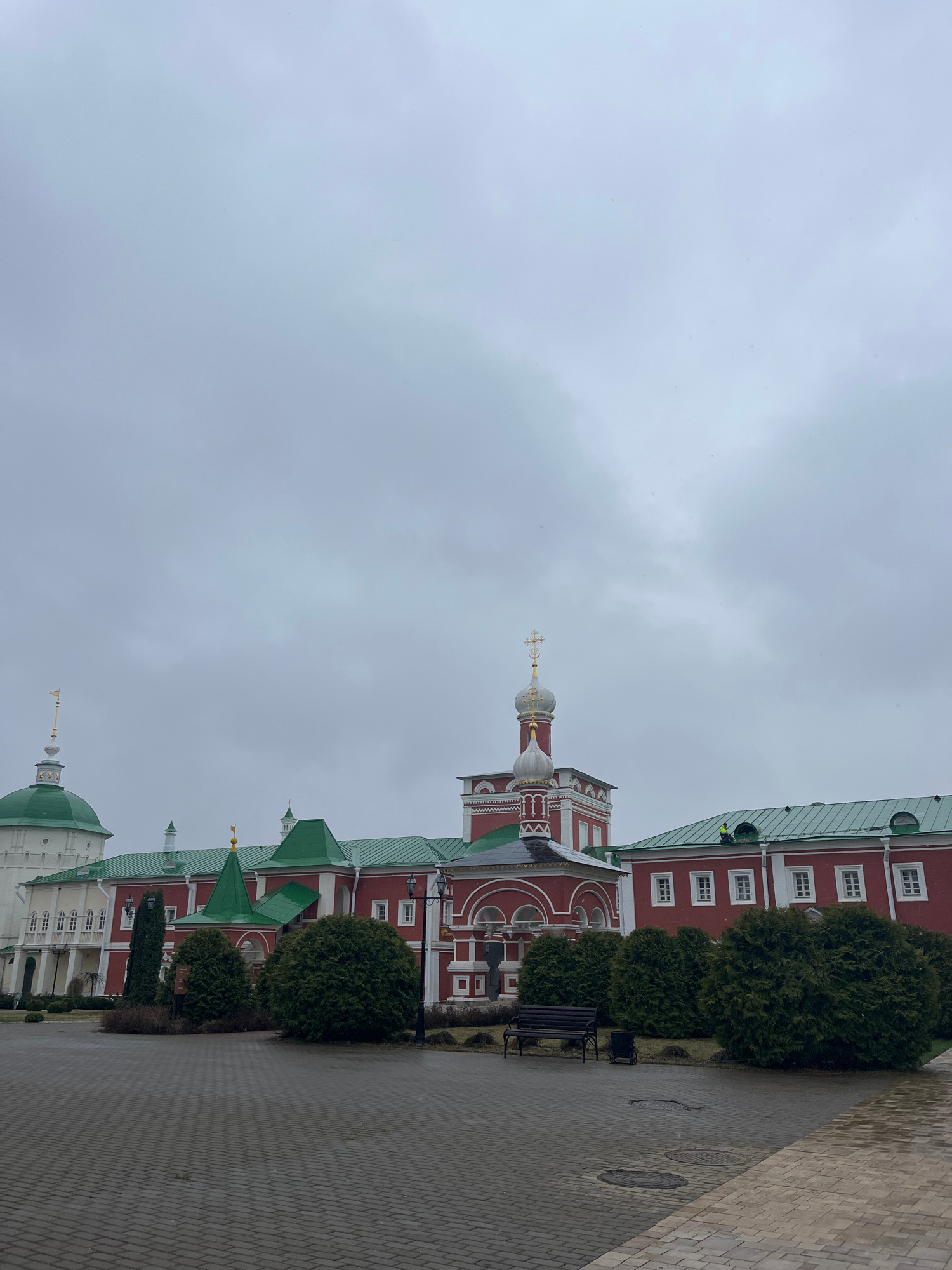 The image depicts a view of the Novodevichy Convent in Moscow, Russia. The architecture is characterized by red and white buildings with green roofs and domes, topped with gold crosses. A paved walkwa…read more
