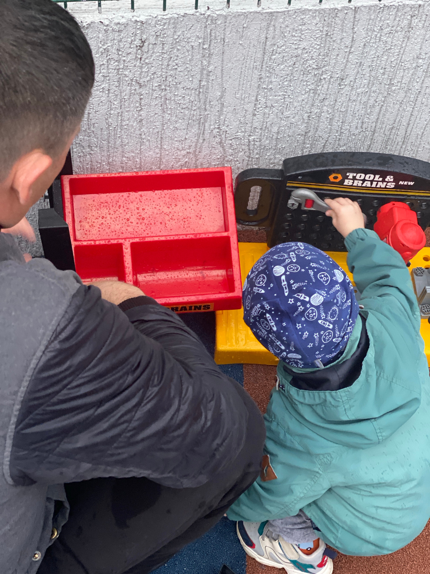 A child wearing a blue hat patterned with white celestial objects (planets, stars, rockets) and a light green jacket is playing with a "TOOL & BRAINS" branded toy workbench, which includes a red toolb…read more