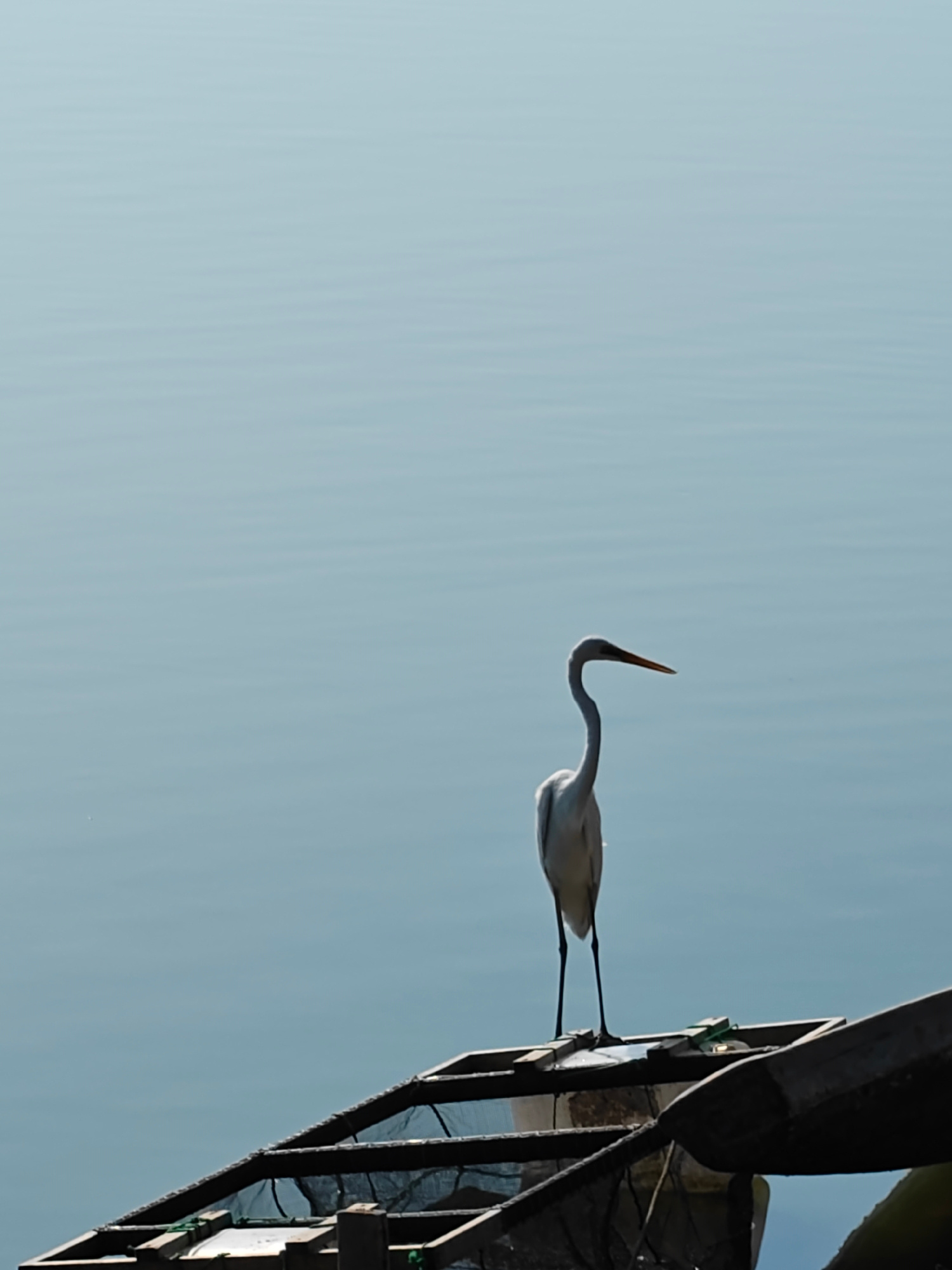 A solitary white egret stands prominently on a dark, multi-framed wooden structure, likely a portion of a fishing raft or aquaculture apparatus, in the calm waters of Lhokseumawe, Indonesia. The egret…read more