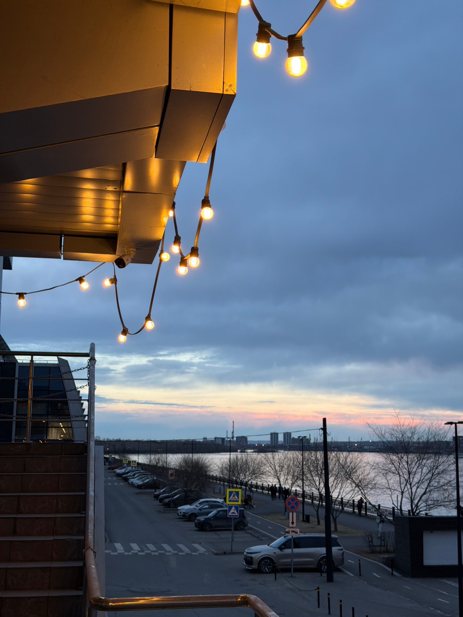 The image depicts a twilight scene in Krasnoyarsk, Russia. A view of the Yenisey River is visible in the background, with a strip of orange sunset light present just above the treeline. Along the rive…read more