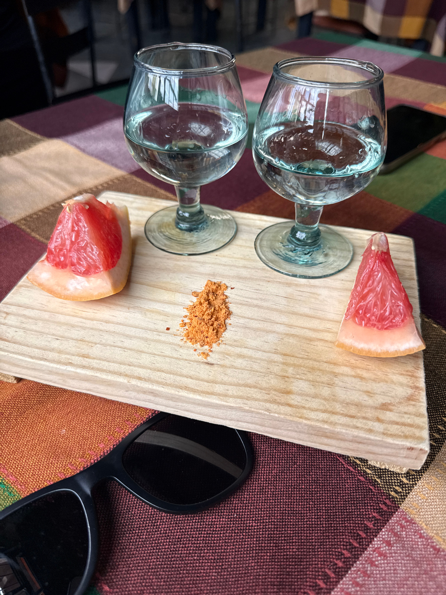 Two wine glasses filled with liquid sit tilted on a wooden board. The board also holds two grapefruit wedges and a small pile of reddish-brown powder. Next to the board, on a surface with a colorful p…read more