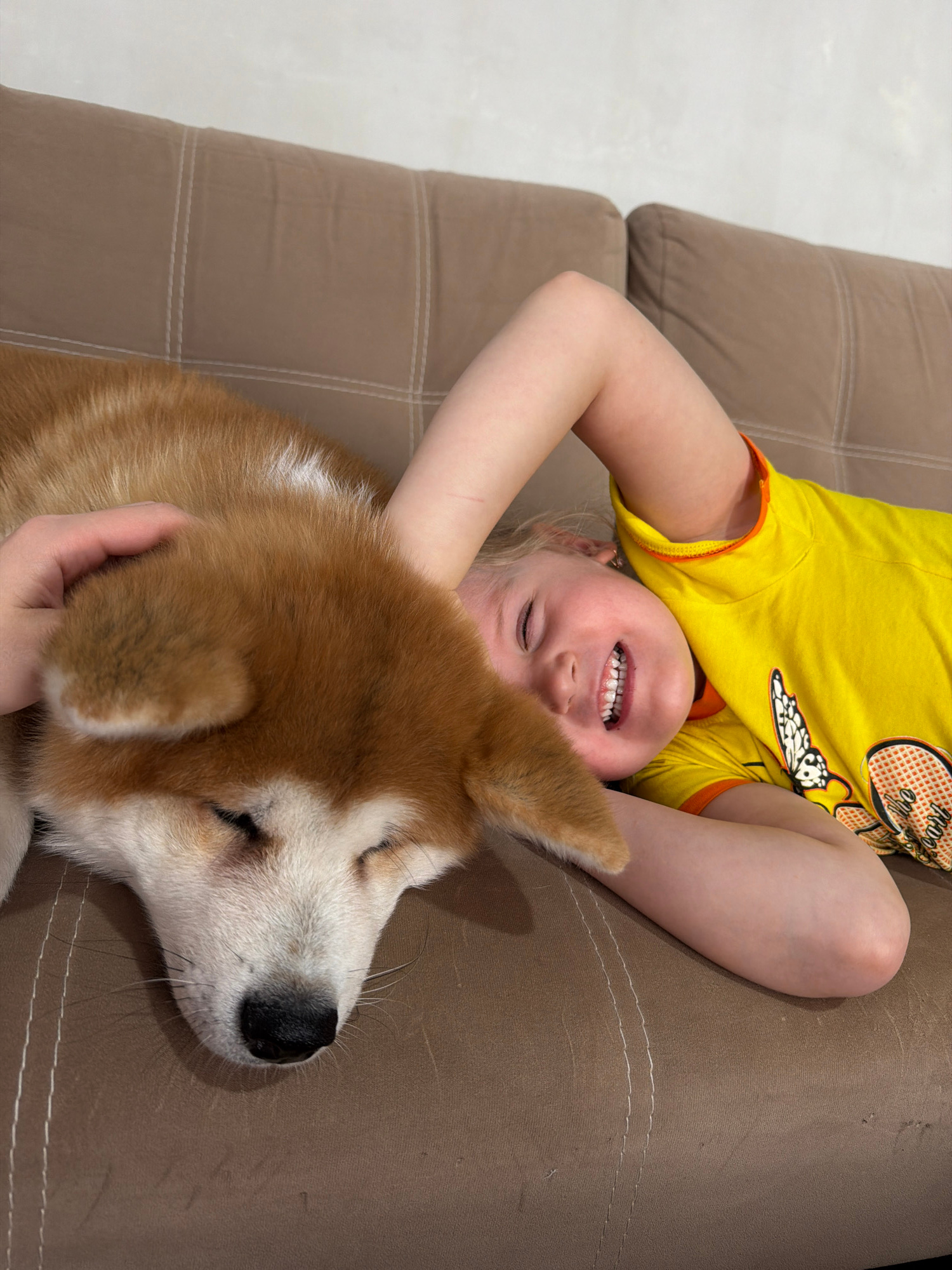A young child wearing a yellow t-shirt with a graphic print is lying upside down on a brown sofa. The child is smiling with teeth visible. An Akita dog is lying next to the child, and the child is tou…read more