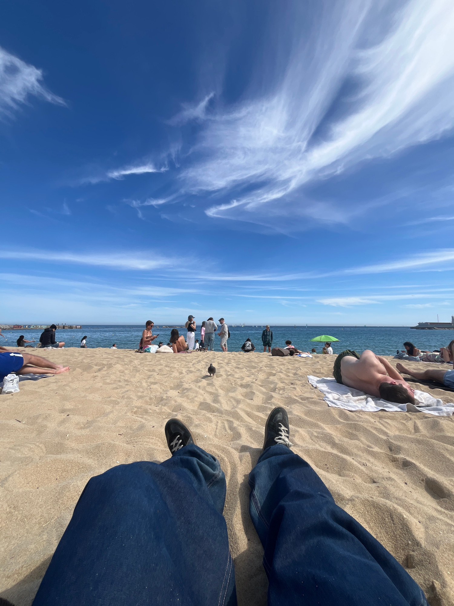 The scene is a beach in Barcelona, Spain, on a clear day with blue skies and wispy clouds. The perspective is from someone sitting on the sand, with their legs and feet in the foreground, clad in blue…read more