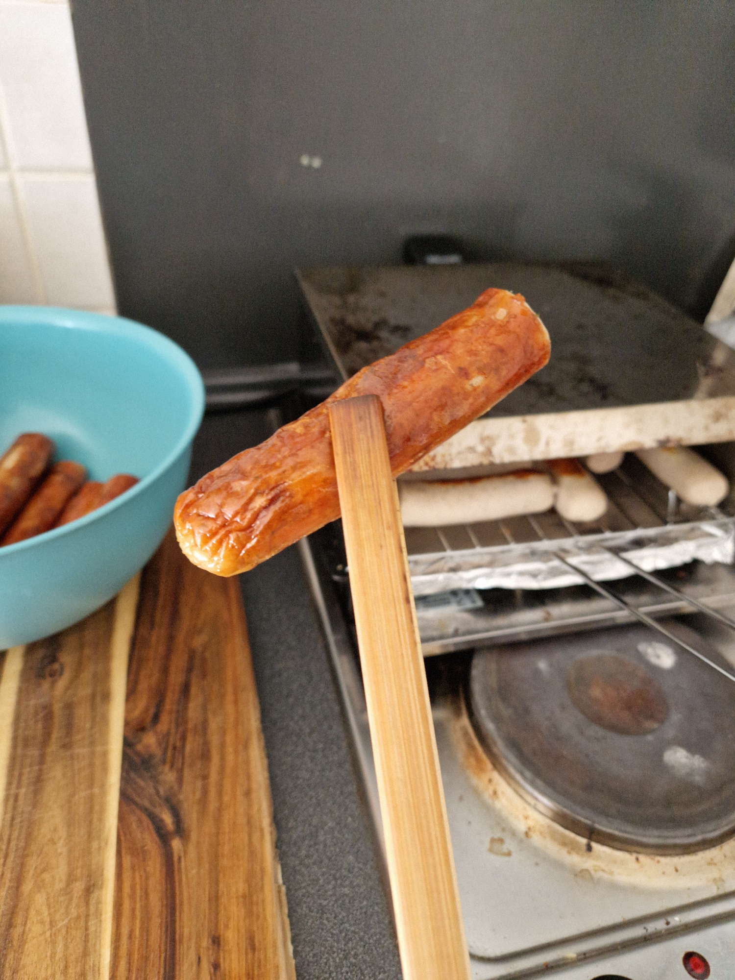 The image shows a cooked sausage held by wooden tongs over a blue bowl filled with more cooked sausages. Behind the bowl, there's a wooden cutting board. In the background, a stove and broiler are vis…read more