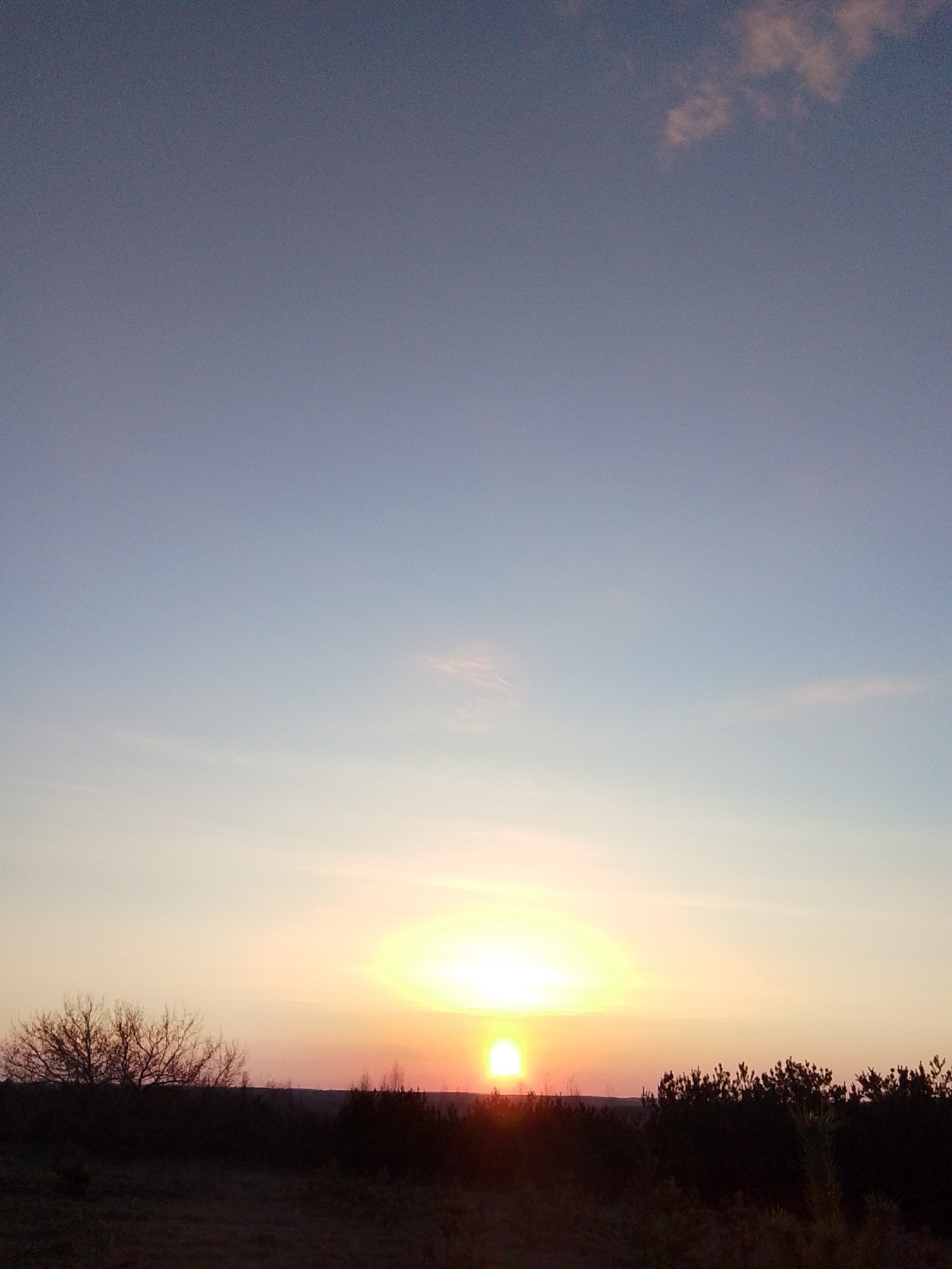 The image displays a tranquil natural landscape captured during either sunrise or sunset. The sky dominates the upper two-thirds of the frame, showcasing a beautiful gradient of colors. At the very to…read more