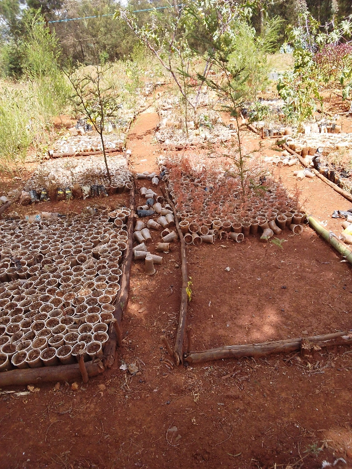 This image depicts an outdoor plant nursery or cultivation area located in Ndeiya, Kenya. The ground consists predominantly of reddish-brown soil. In the foreground, two distinct rectangular planting…read more