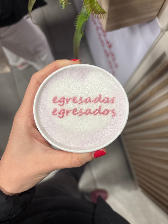 The image captures a close-up, top-down view of a white disposable cup held by a human hand. The hand, featuring red manicured fingernails, grasps the cup from the right side. The cup's contents are t…read more