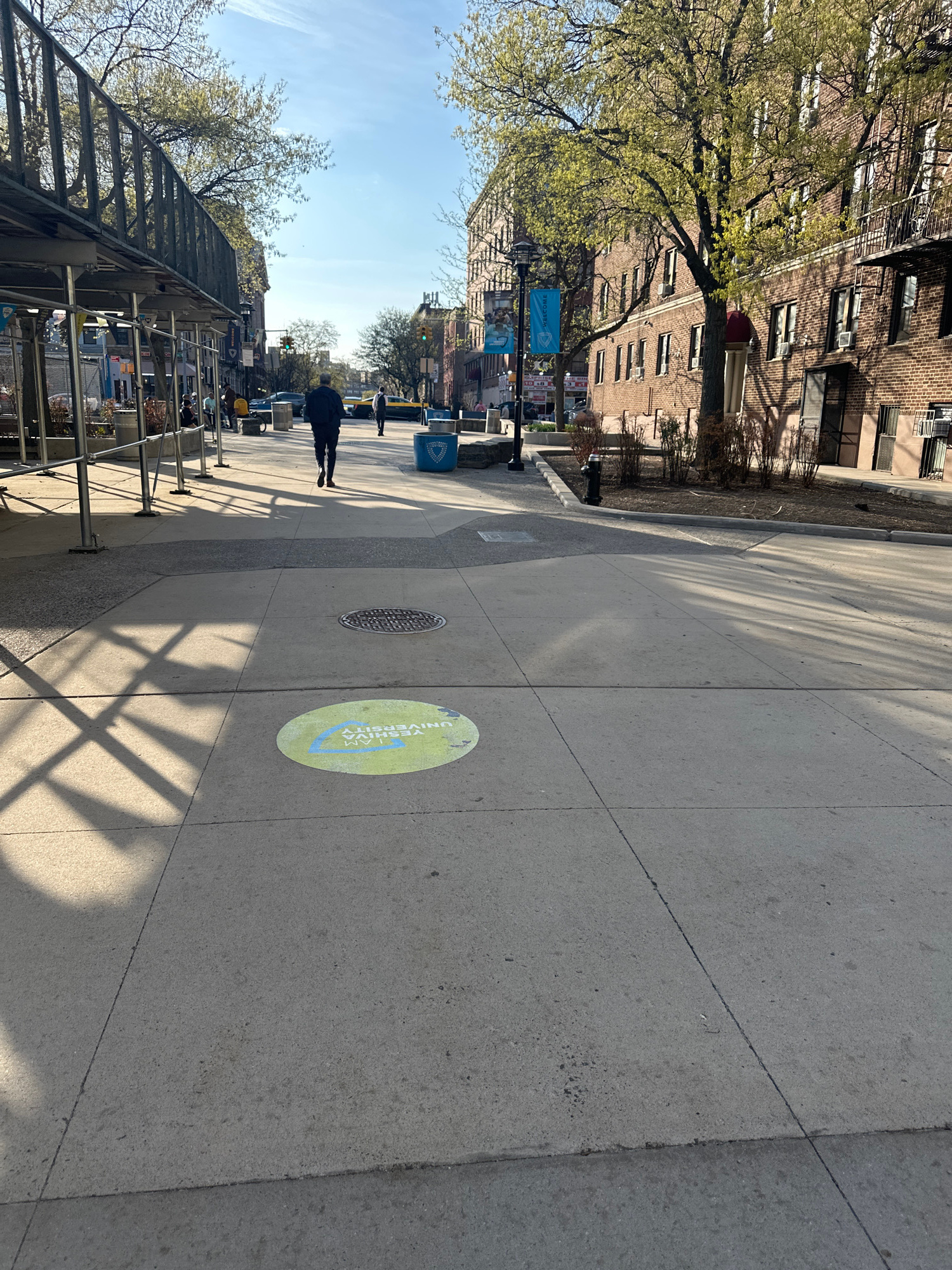 The image depicts a sidewalk in New York City, United States of America. The sidewalk is made of concrete slabs. Shadows of trees and scaffolding cast dark lines across the surface. A green circular s…read more