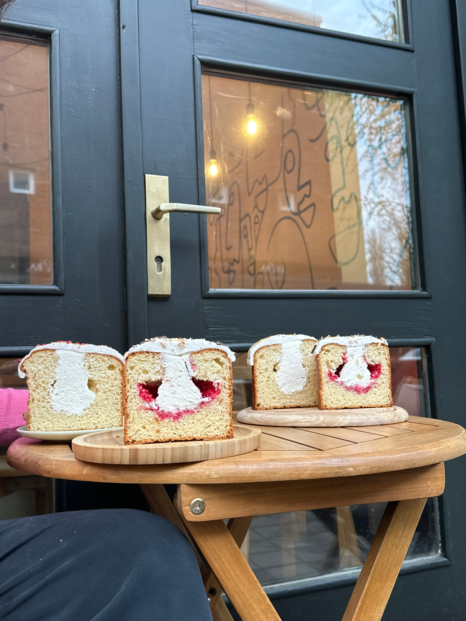 The image shows four square slices of cake, each containing a white cream filling and red jam or fruit filling, presented on a wooden multi-tiered serving stand. The cake slices are stacked vertically…read more
