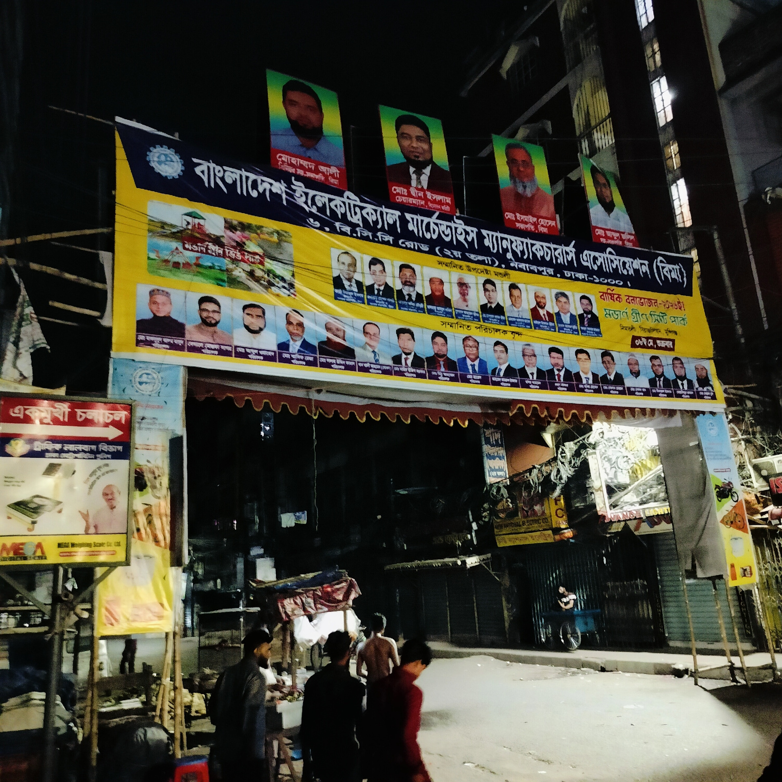 The image captures a street scene in Dhaka, Bangladesh at night. An archway spans the street, adorned with a yellow banner. This banner features the name of an organization in Bengali, "Bangladesh Ele…read more