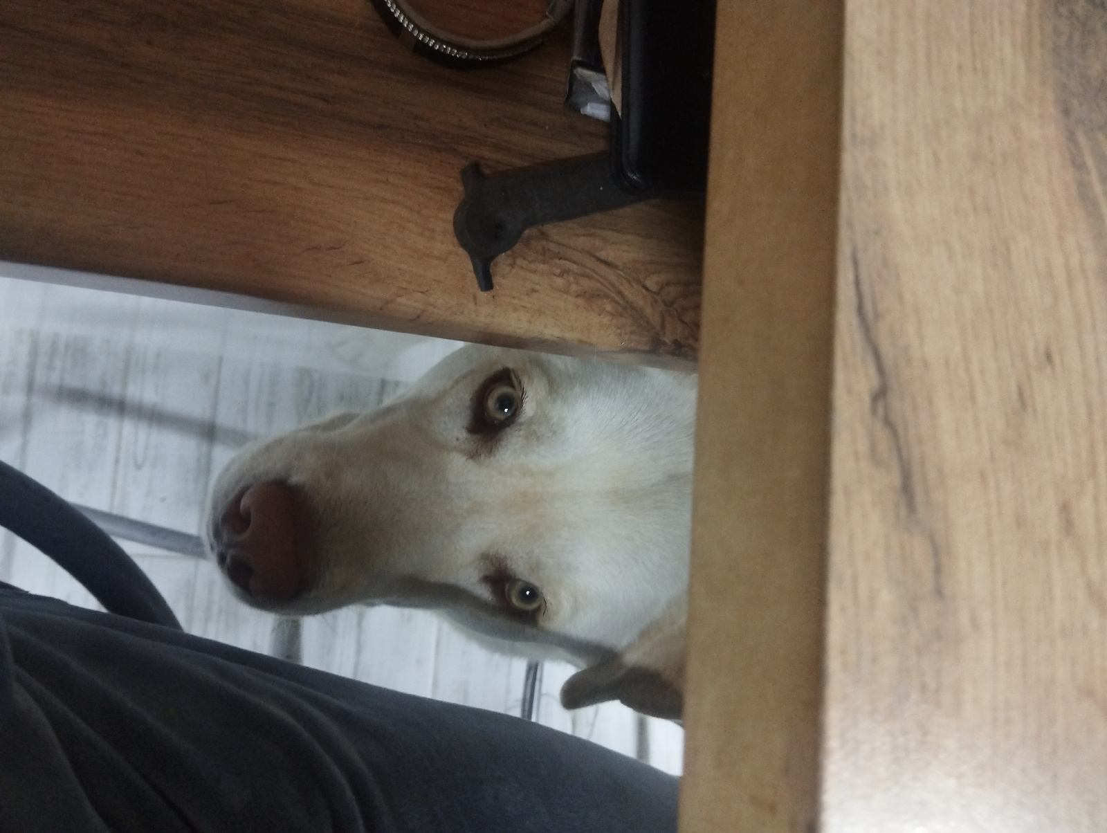 A white dog with light brown eyes peers out from under a wooden table. The dog's nose is prominently visible, and a person's leg is visible in the foreground. The table has a metal hinge and a dark ob…read more