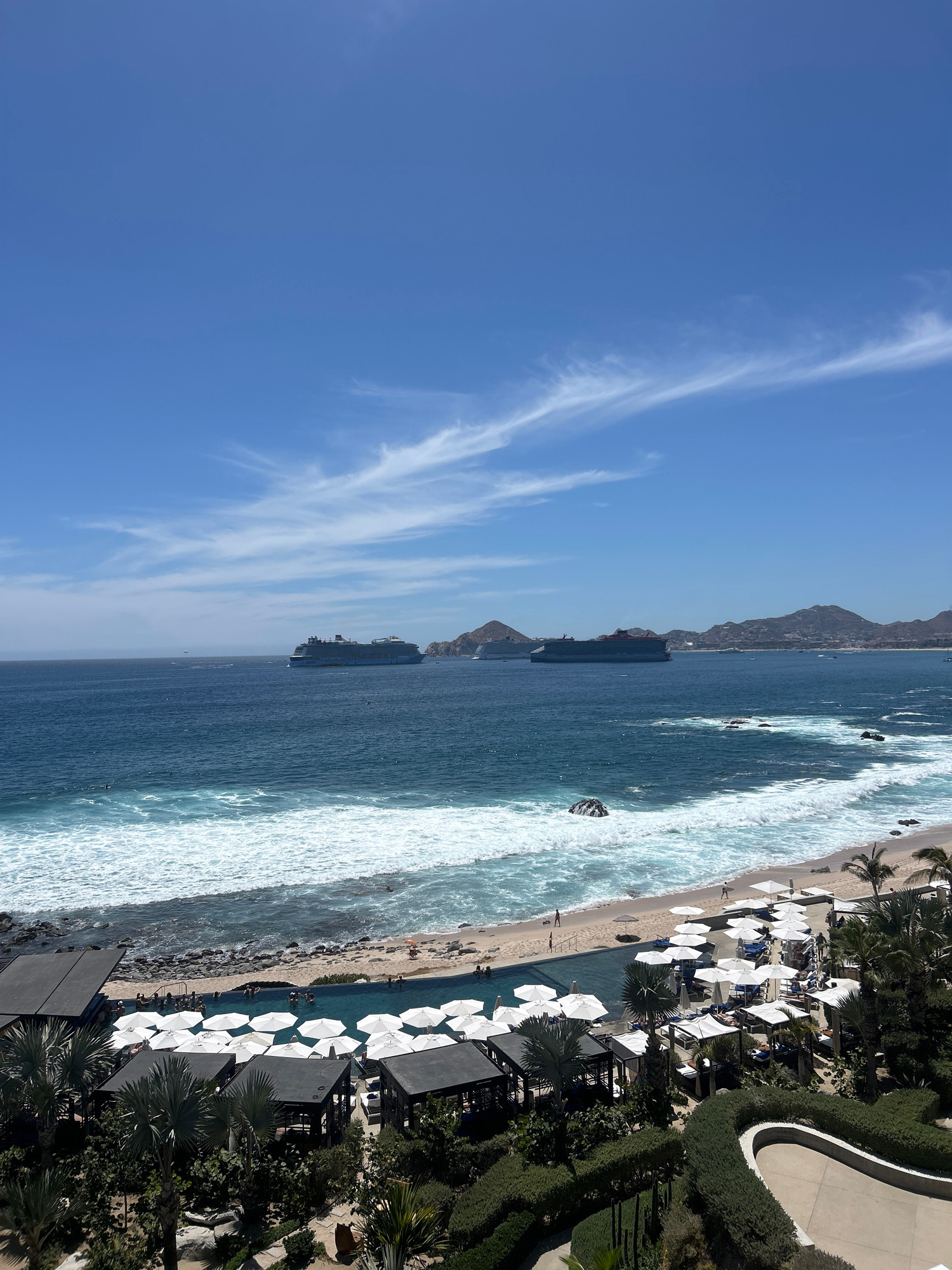 The image depicts a beach scene in Cabo San Lucas, Mexico, taken from an elevated perspective. A prominent cruise ship is visible in the ocean, positioned relatively close to the shore. The beach is l…read more