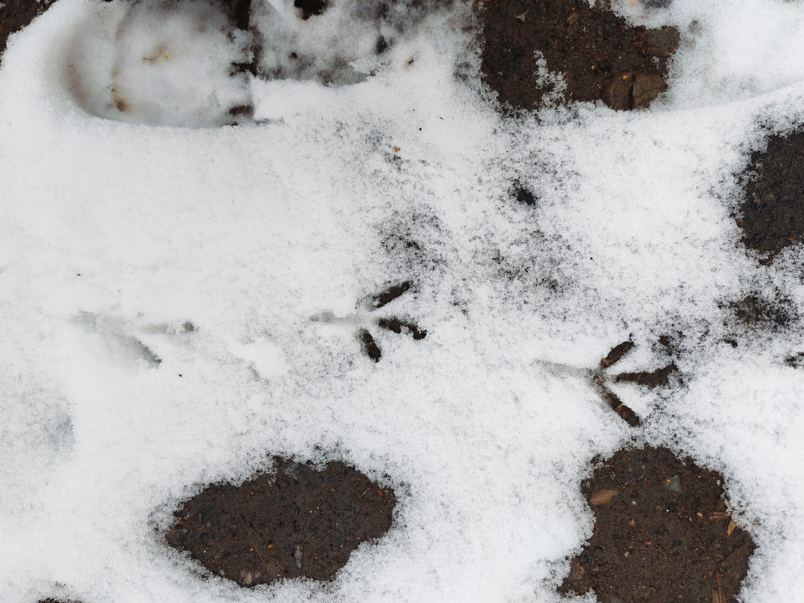 The image depicts a patch of snow-covered ground interspersed with exposed dark soil. Visible within the snow are three distinct sets of bird tracks, arranged linearly from left to right. A larger, ci…read more