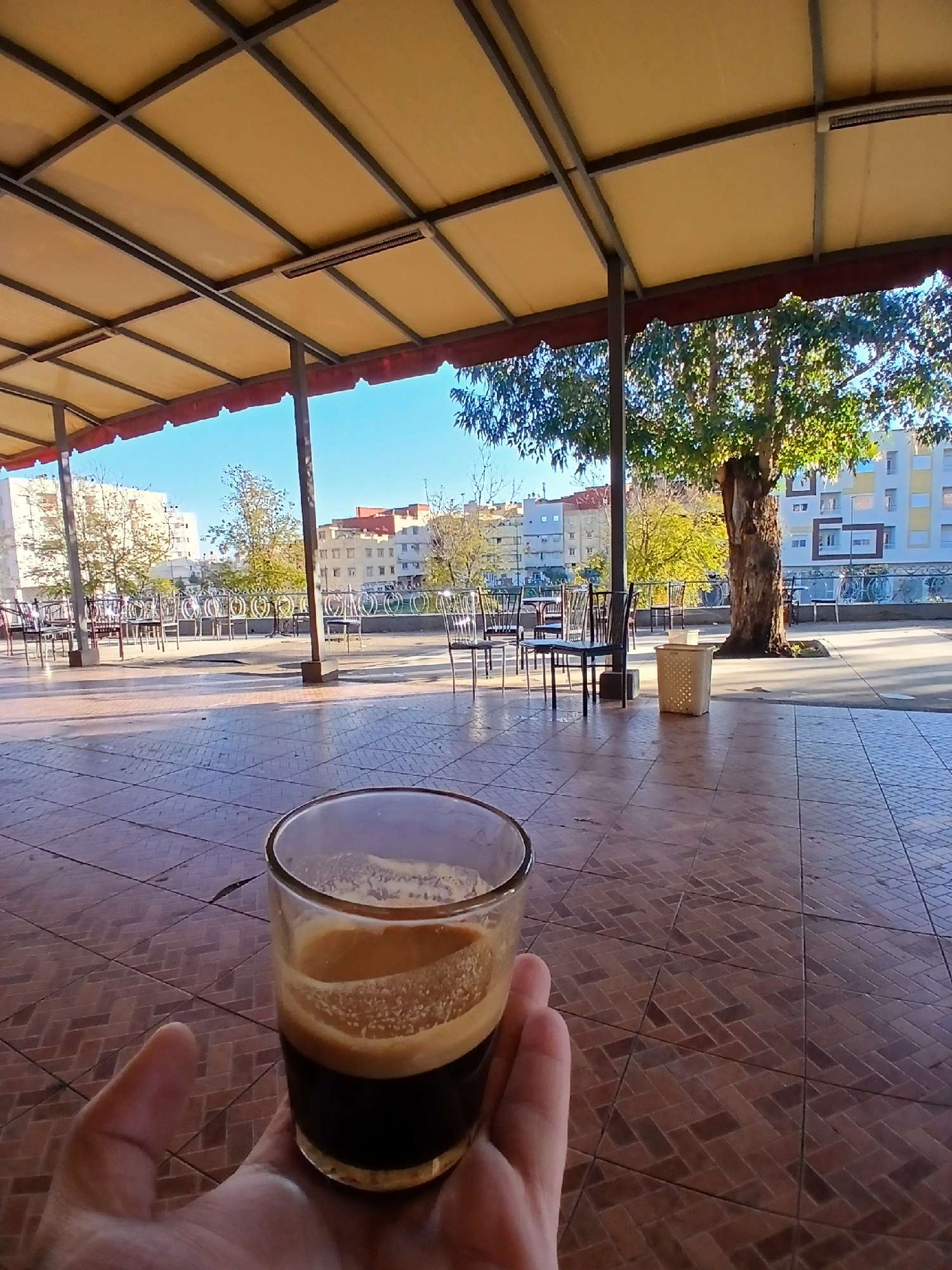 The image shows a hand holding a glass of coffee at an outdoor cafe, likely in Meknes, Morocco, based on the architectural style visible in the background. The cafe has a covered seating area with a m…read more
