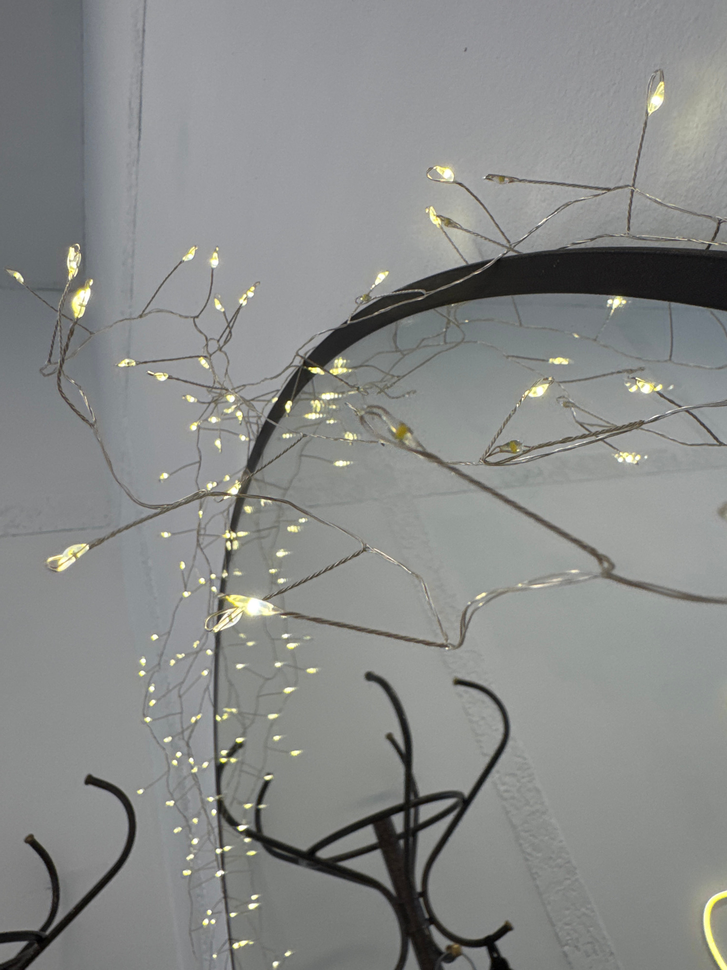 The image depicts a ceiling with a decorative lighting fixture. The fixture consists of thin, wire-like branches adorned with small, warm-toned LED lights. Parts of a black, wrought-iron structure are…read more