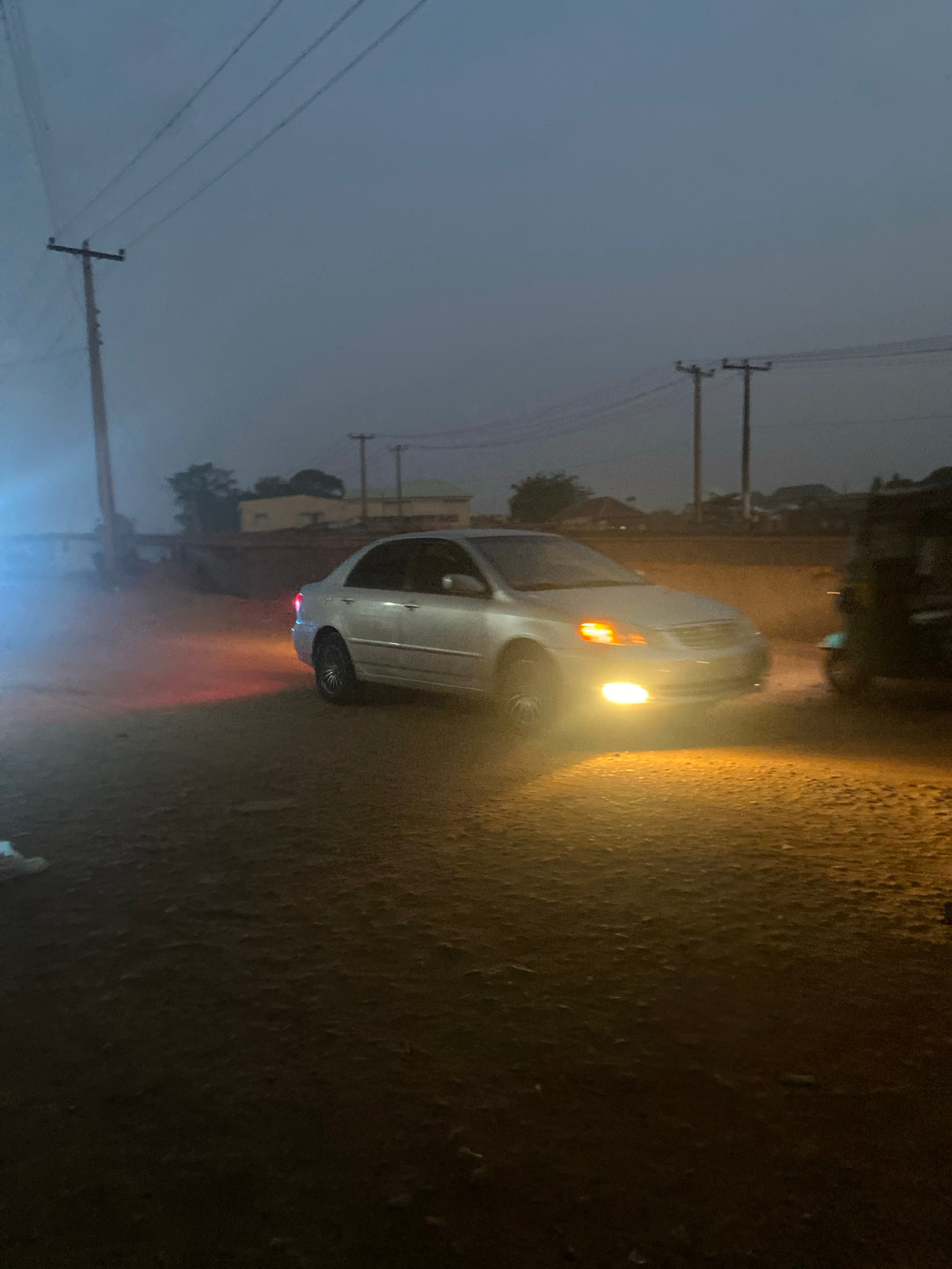 A car is parked on a wet street in Tudun Wada, Nigeria. The car's headlights and taillights are illuminated. Power lines and utility poles are visible along the side of the road. The sky is overcast.…read more