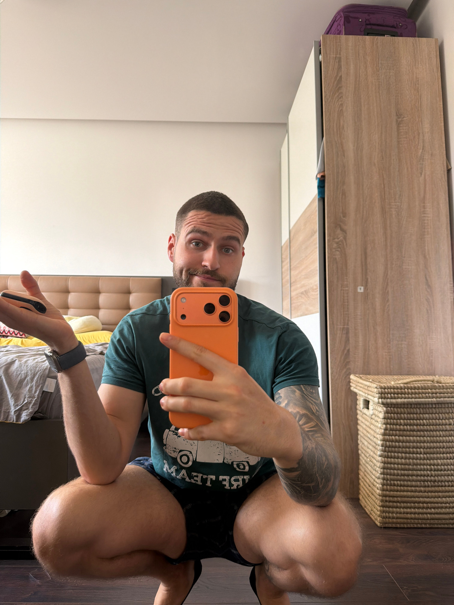 The image is a selfie taken in a room with a wardrobe, a wicker basket, and a bed with a headboard. The person taking the selfie is holding an orange phone and wearing a dark green t-shirt, dark short…read more