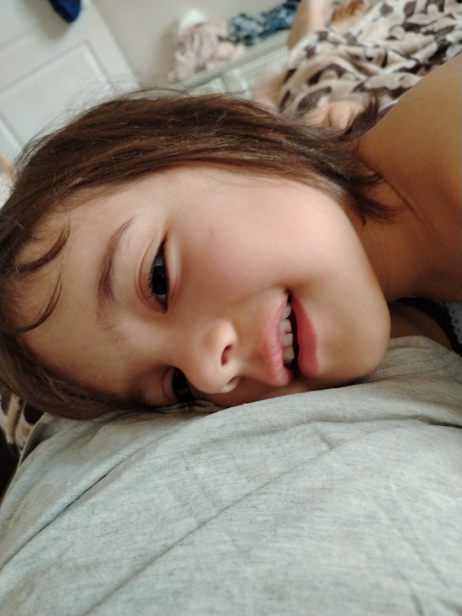A young child with dark brown hair and eyes is lying on their side, smiling. The child is resting their head on a gray fabric surface, likely a blanket or article of clothing. In the background, an ouβ¦read more