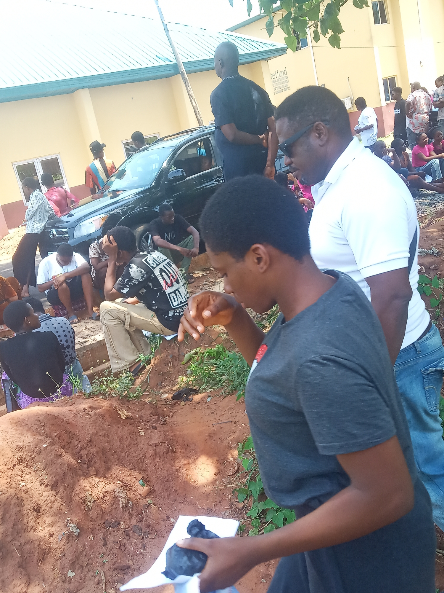 The image shows a scene in Ukwu-Abwa, Nigeria. Several people are gathered outdoors, some seated on a low concrete wall, others standing. A dark-colored car is parked nearby. A man in a white shirt an…read more