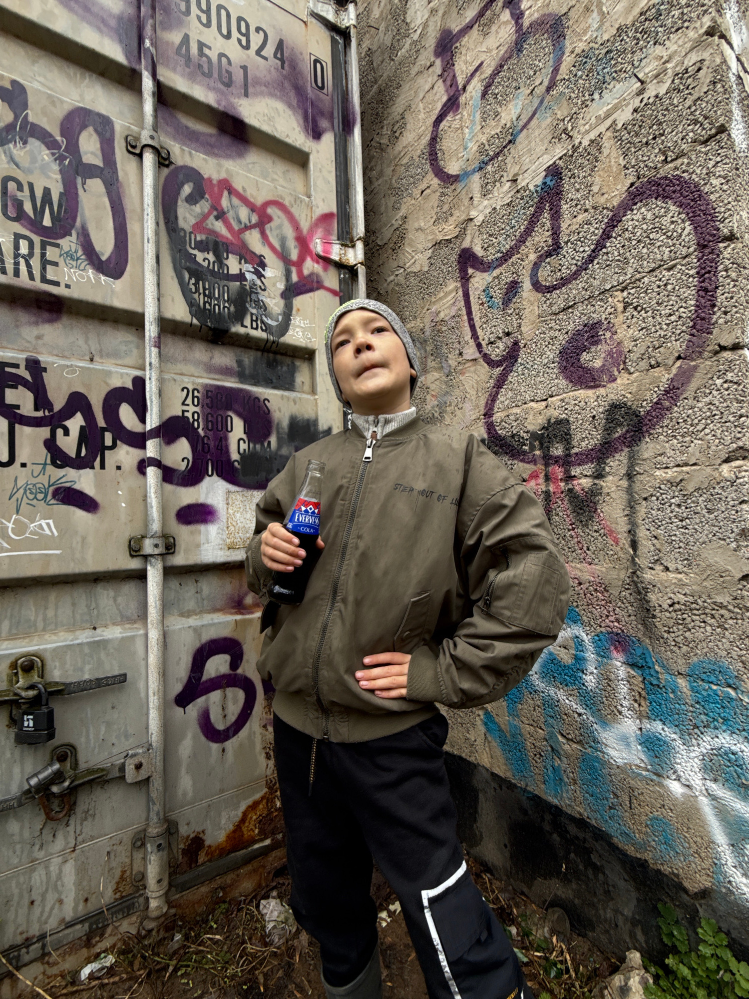 A young person with a beanie is in an alley between a wall with graffiti and a metal cargo container with graffiti and a lock, holding an "EVERVESS - COLA" soda bottle. The graffiti on the wall is mos…read more
