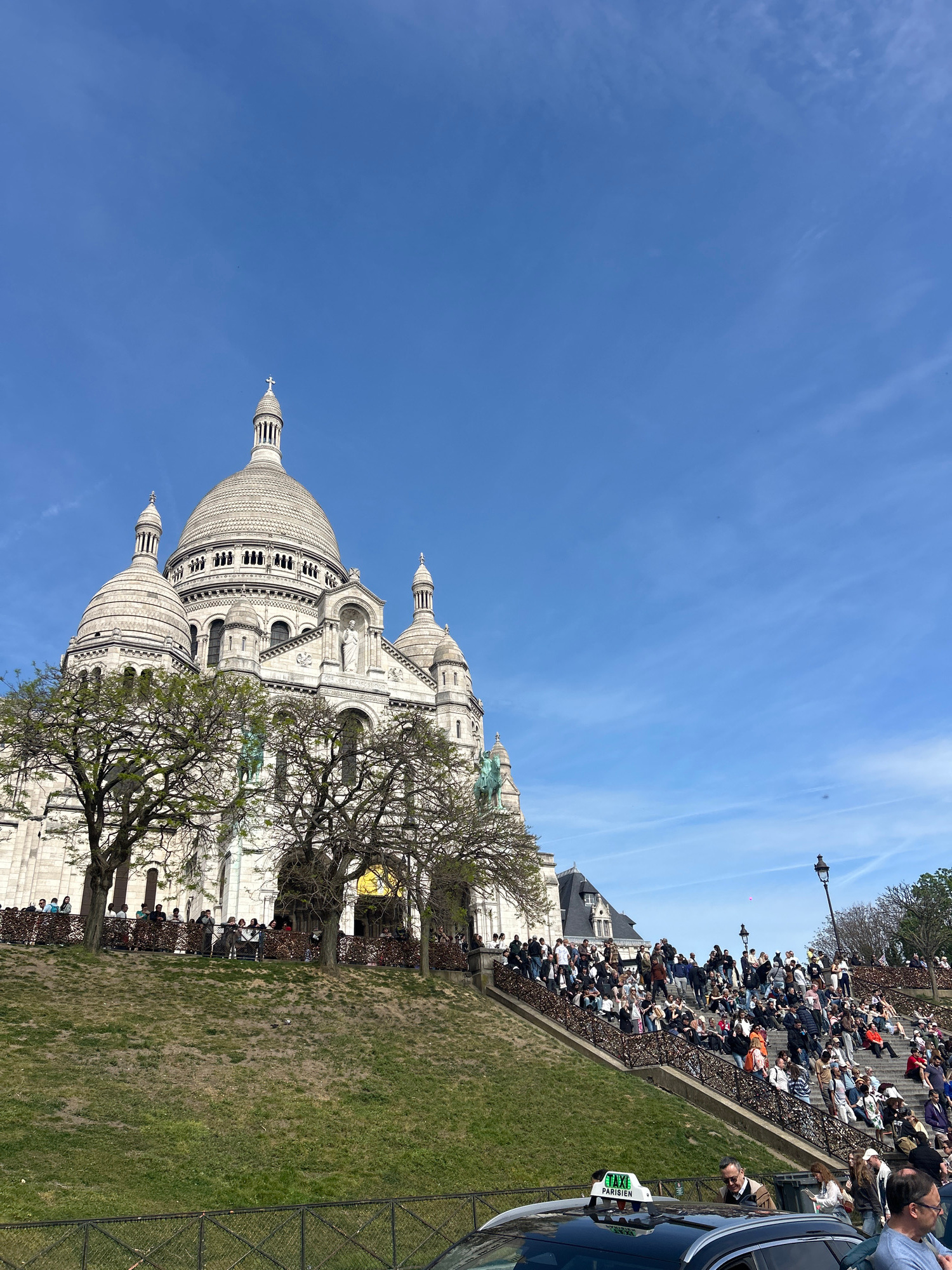 The image is of the Sacré-Cœur Basilica in Paris, France. The basilica, a large white stone building with multiple domes, is the primary subject. Trees with few leaves are in the foreground and partia…read more