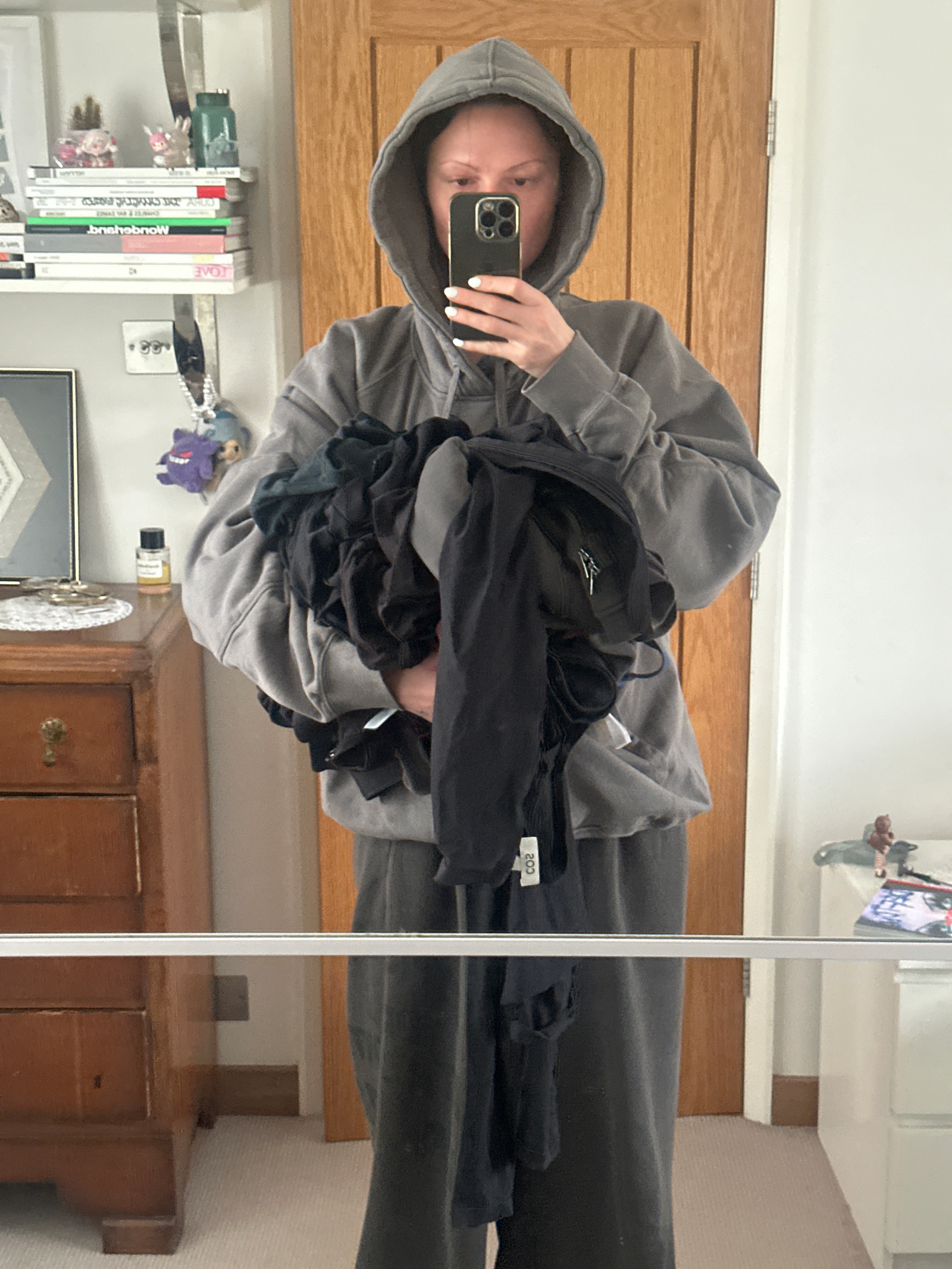 An indoor, waist-up mirror selfie captured in Tunbridge Wells, United Kingdom, depicts a female subject holding a quantity of dark clothing. The subject wears a plain grey hooded sweatshirt with the h…read more