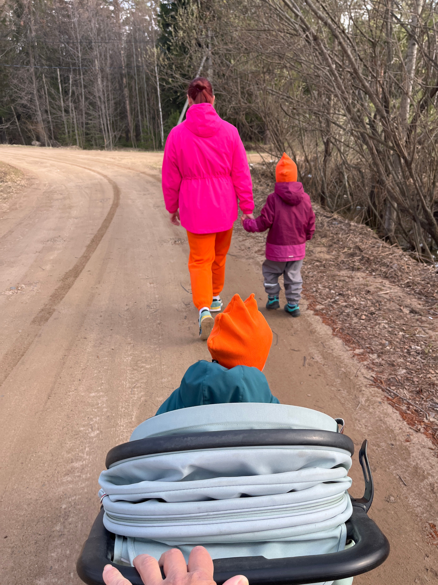 The image depicts a dirt path in a natural area, likely in a park or wooded area. A tire track is visible in the path. In the distance, a child in a purple jacket and orange hat walks along the path.…read more