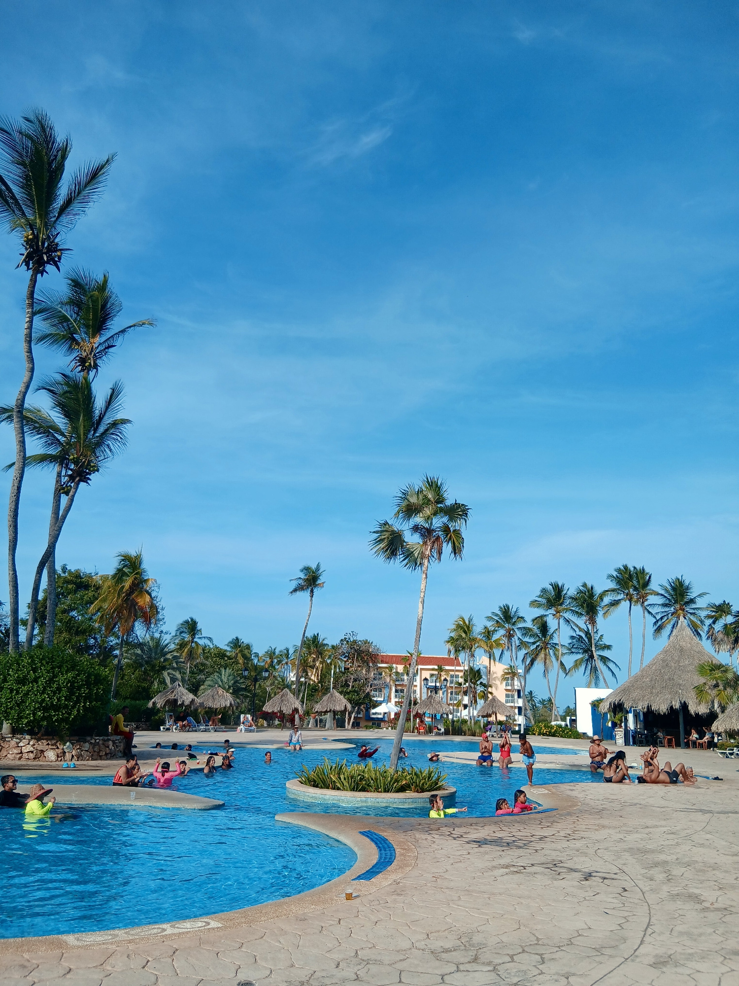 The image shows a view of a resort swimming pool in Playa El Agua, Venezuela. Palm trees line the pool area, and people are swimming, sunbathing, and lounging around the pool. The sky is blue. There a…read more